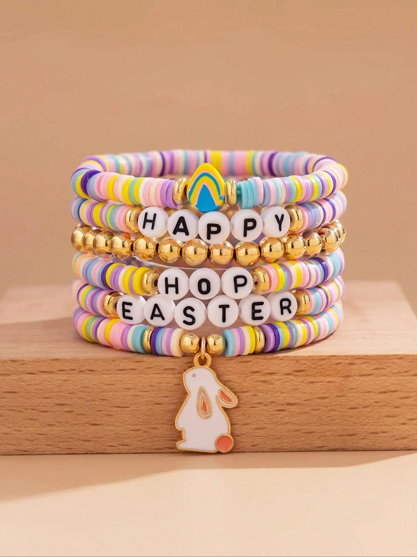 5. Fashion Easter Bunny Egg Pendant Bracelet Set, Colorful Soft Clay Letter Beads, Casual Daily Wear Jewelry Gift for All Seasons
