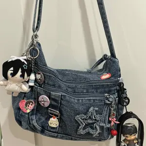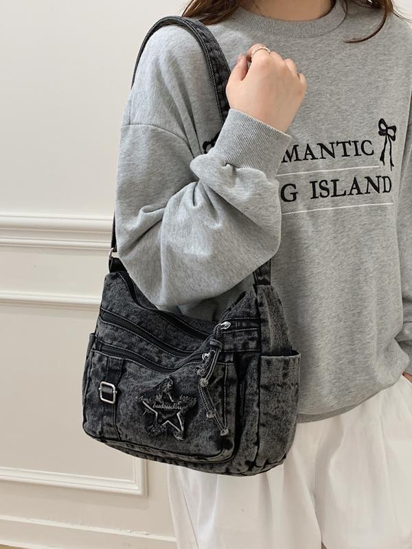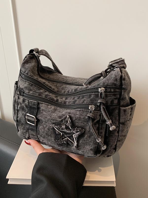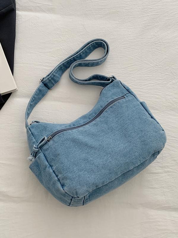 Fashion trend casual Joker shoulder messenger bag, Denim messenger bag, niche design retro wash jeans craft commuter shoulder messenger bag, personality versatile multi-zipper design suitable for student , shopping, trips and so on.