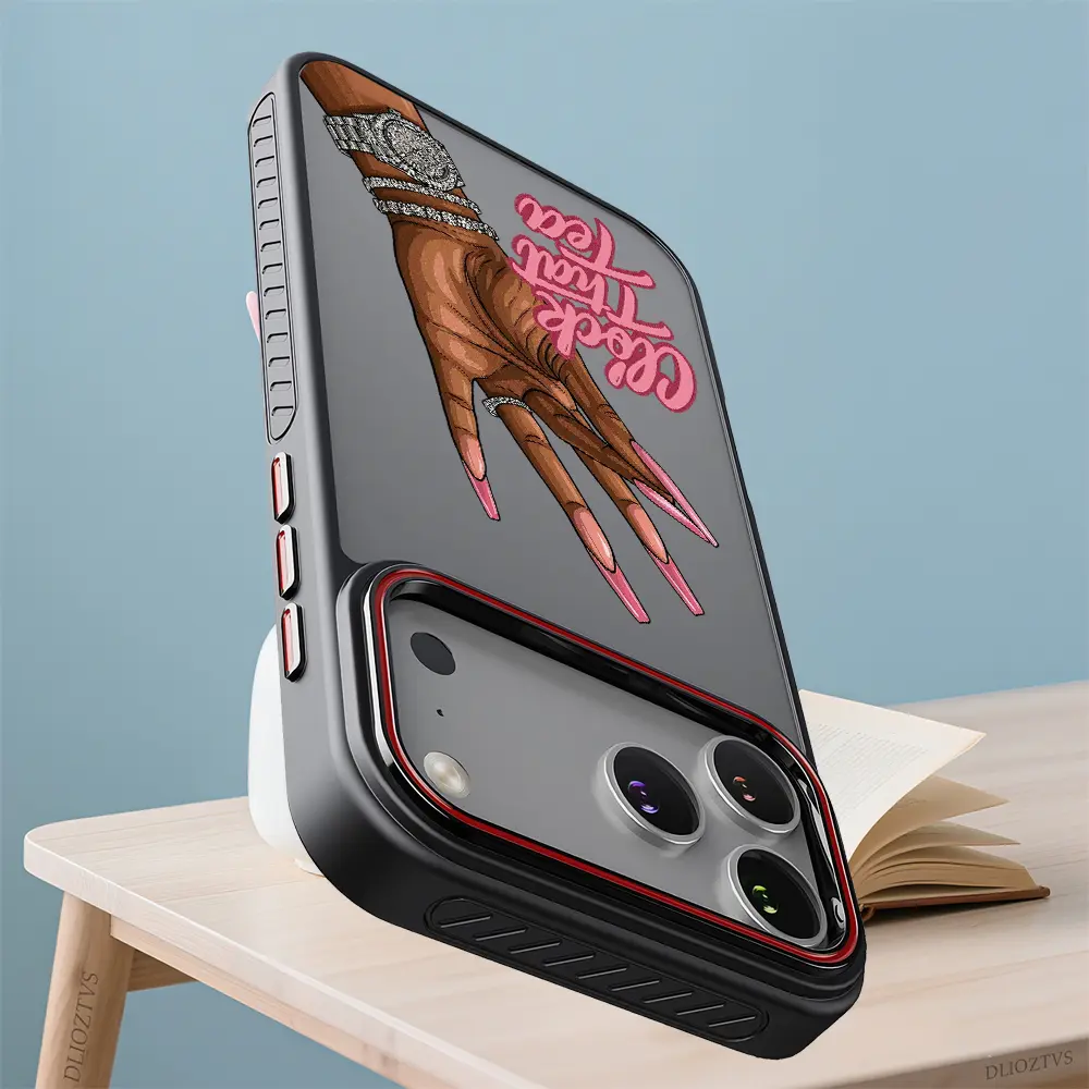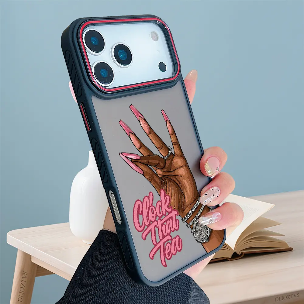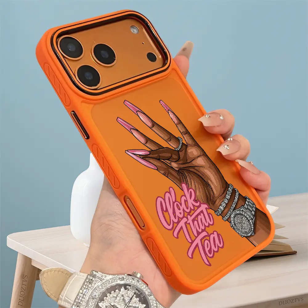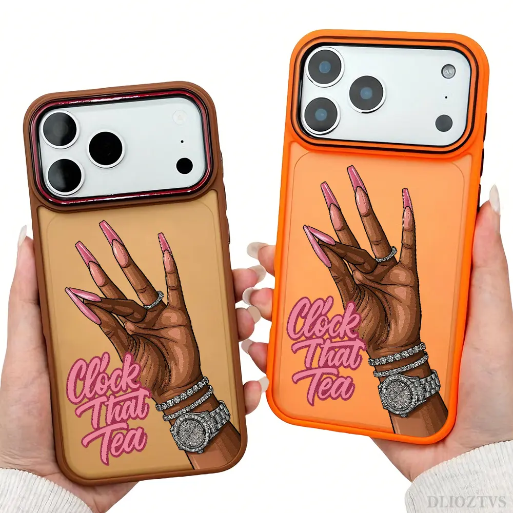 Β·Design: This phone case features a Fashion Hand and Clock That Tea Text pattern. It includes color blocking, button, and camera frame design. π