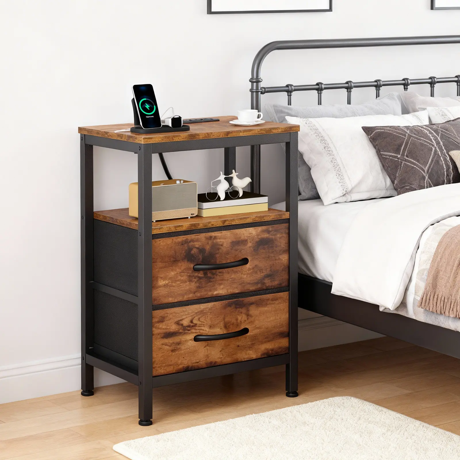 🌟 Fast Charging Bedside Table with 2 Fabric Drawers 🌟