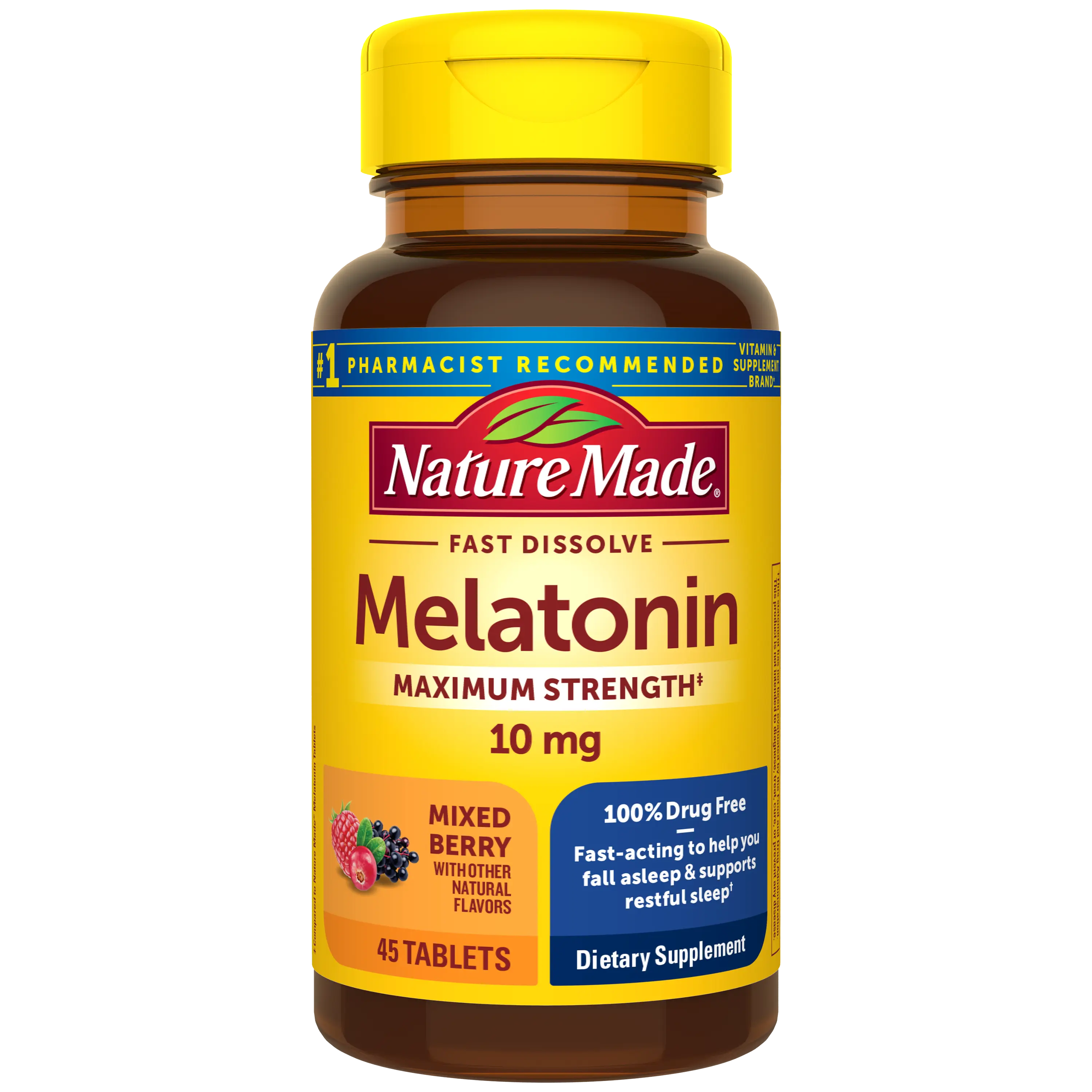 A delicious way to get our maximum strength sleep support. Nature Made® Melatonin 10 mg Fast Dissolve Tablets come in a tasty Mixed Berry flavor and help you fall asleep faster and support restful sleep. It's a drug-free way to occasionally support your rest.†
