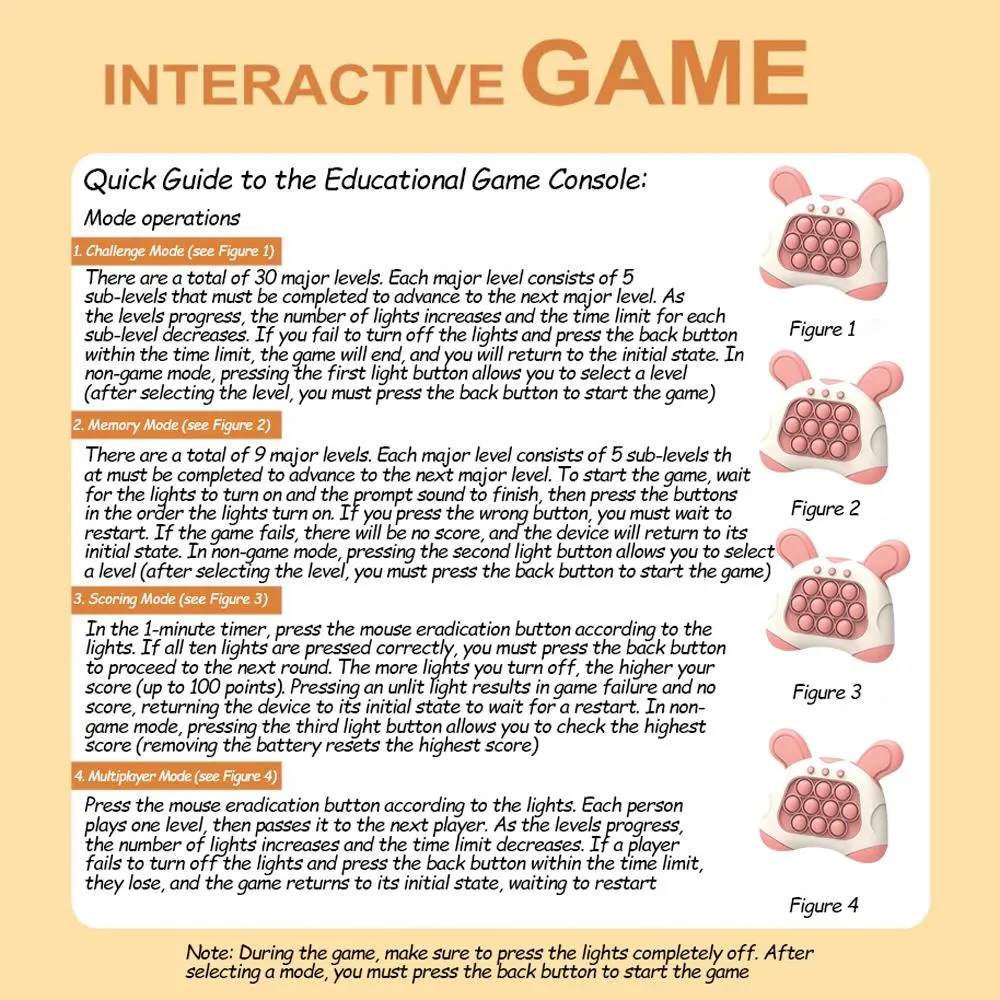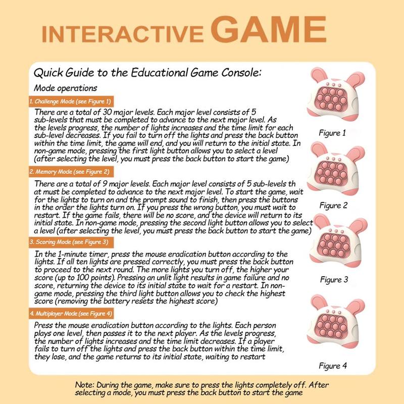 ·Enjoy Anytime, Anywhere: Our fast push puzzle game console is compact, lightweight, portable, easy to hold, and great for sharing. Whether traveling or during work-life relax, you can enjoy the fun of the game anytime and anywhere. The volume is adjustable, so it won't overly disturb others. Enjoy a game of pressing anytime and anywhere!