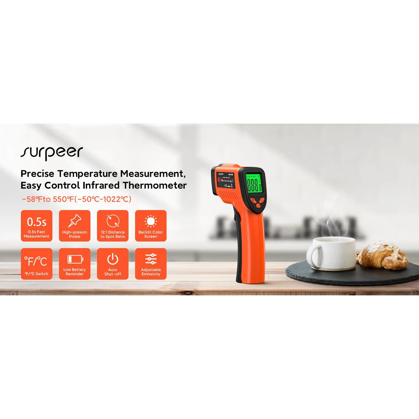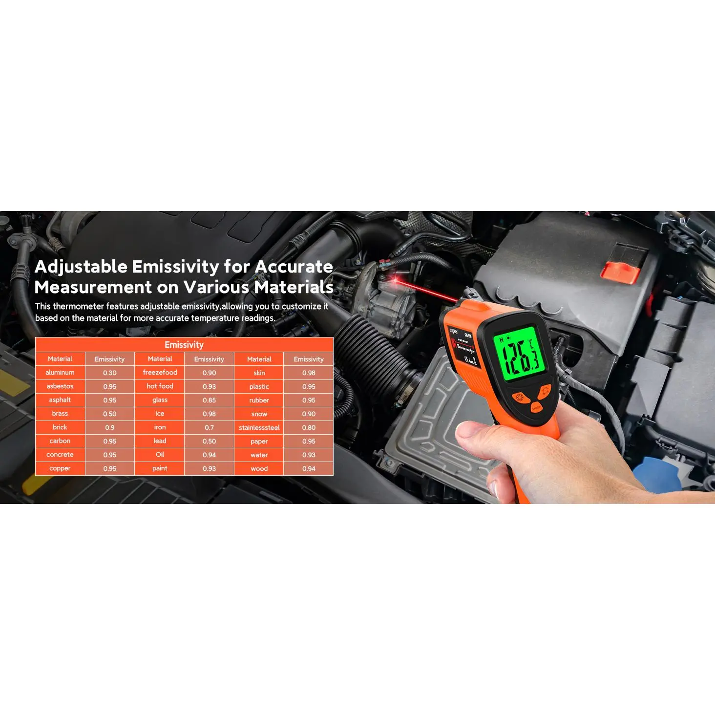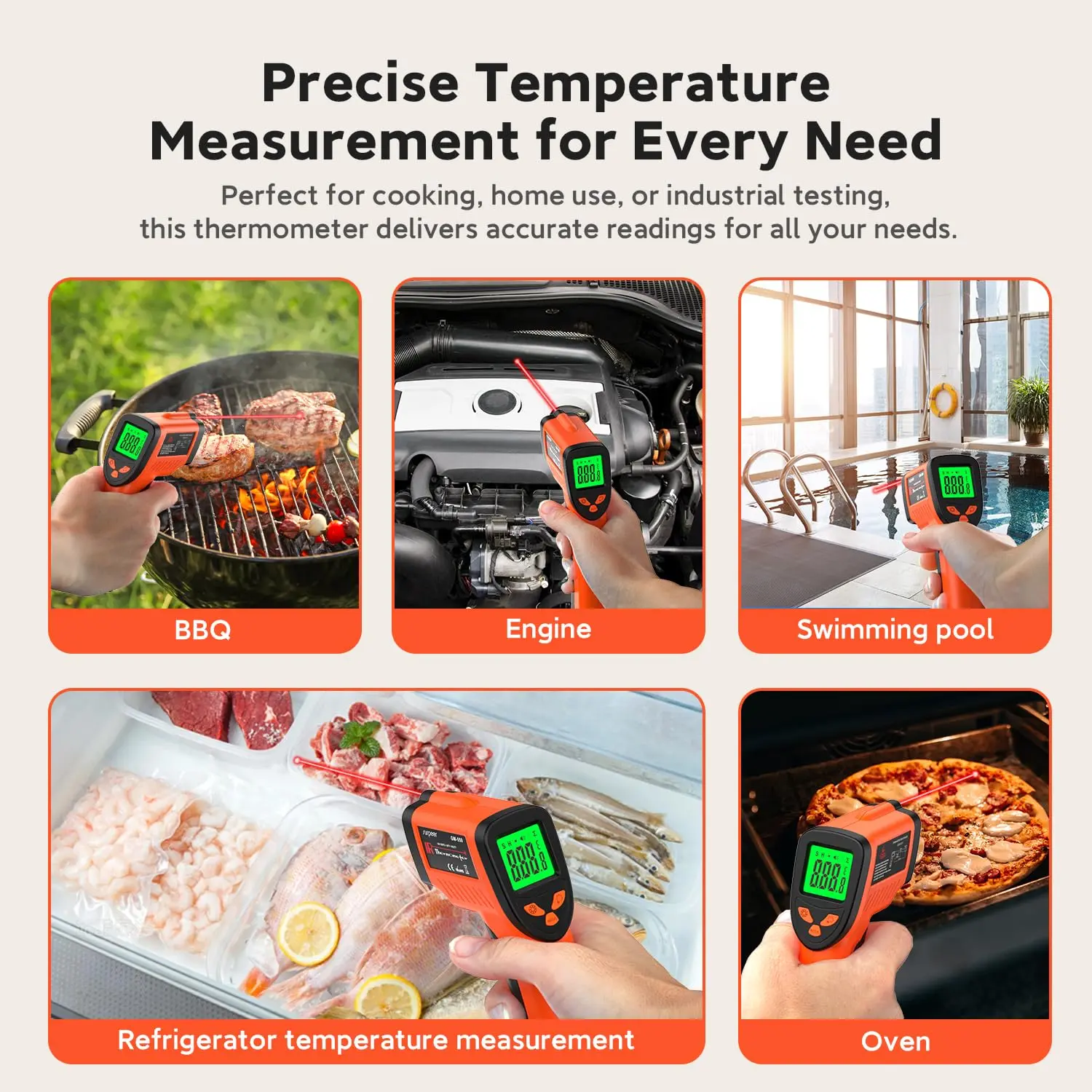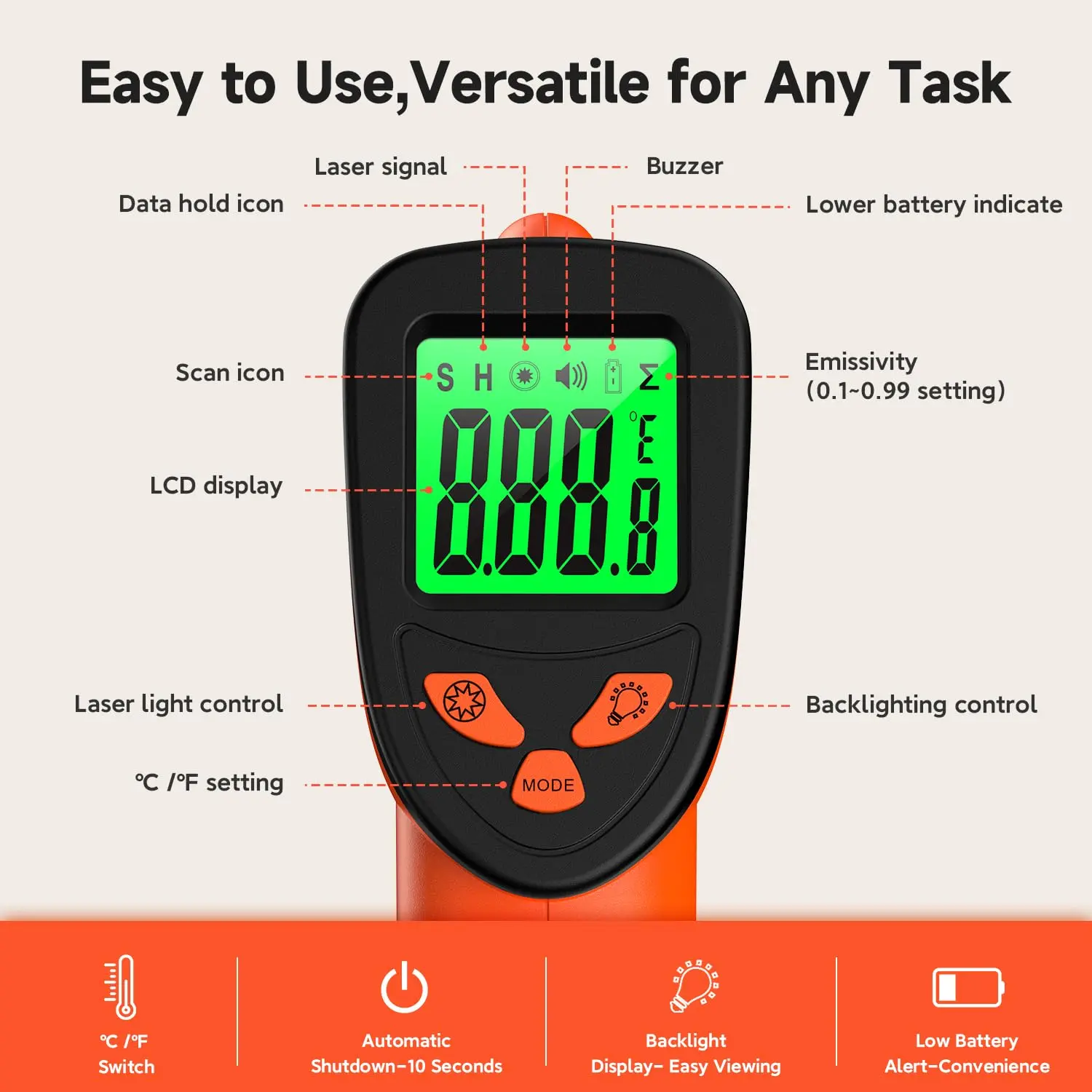 Wide Temperature Range for Various Tasks – This infrared thermometer covers a wide temperature range from -58°F to 1022°F (-50°C to 550°C), making it ideal for cooking, home improvement, automotive repairs, and DIY crafting.Fast and Accurate Measurements – Get readings in just 0.5 seconds with 12:1 distance-to-spot ratio, providing quick, non-contact temperature measurements for a variety of surfaces, from your stove to your car engine.Adjustable Emissivity for Precision – The adjustable emissivity (0.1-0.99) ensures accurate readings across different materials, making this thermometer perfect for measuring the temperature of metals, liquids, and foods during cooking or repairs.Convenient Design for Everyday Use – Featuring a backlit LCD screen for easy reading in any lighting,℉/℃ switching, and a low battery indicator, this thermometer offers user-friendly operation for both beginners and experts.Versatile & Reliable for DIY & Household Use – From BBQ grilling to car maintenance, this infrared thermometer is designed for a wide range of tasks. Not for use on humans or animals. Our 24/7 customer support is always available to help.
