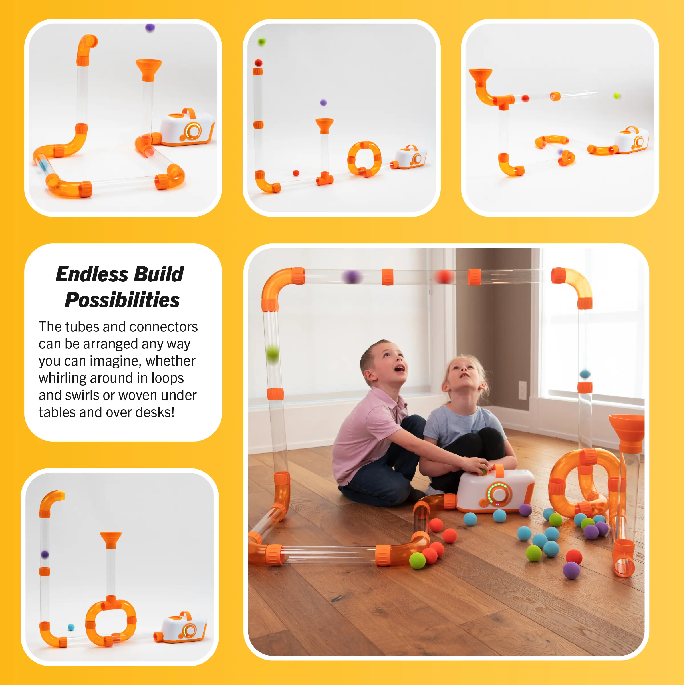 This kid-safe turbine sends foam balls flying through a network of modular tubes. Arrange the tubes any way you can imagine and experiment with airflow and physics to create amazing stunts! Great as science kits for kids and educational toys for kids, this toy encourages spatial reasoning, creativity, experimentation, and problem-solving. It doubles as toddler science toys and stem toys for kids, making it versatile for different age groups. Suitable for kids ages 3 and up, it offers up to 3 hours of run time per charge and recharges in under 2 hours. Featuring a plug-in to recharge (no batteries needed), it includes 20 foam balls and has an auto shut-off feature after 15 minutes to prevent battery drain. If you are looking for toddler building toys, this product fits the bill. Ideal for both indoor and toddler outdoor toys, it acts as great educational toys for all ages.