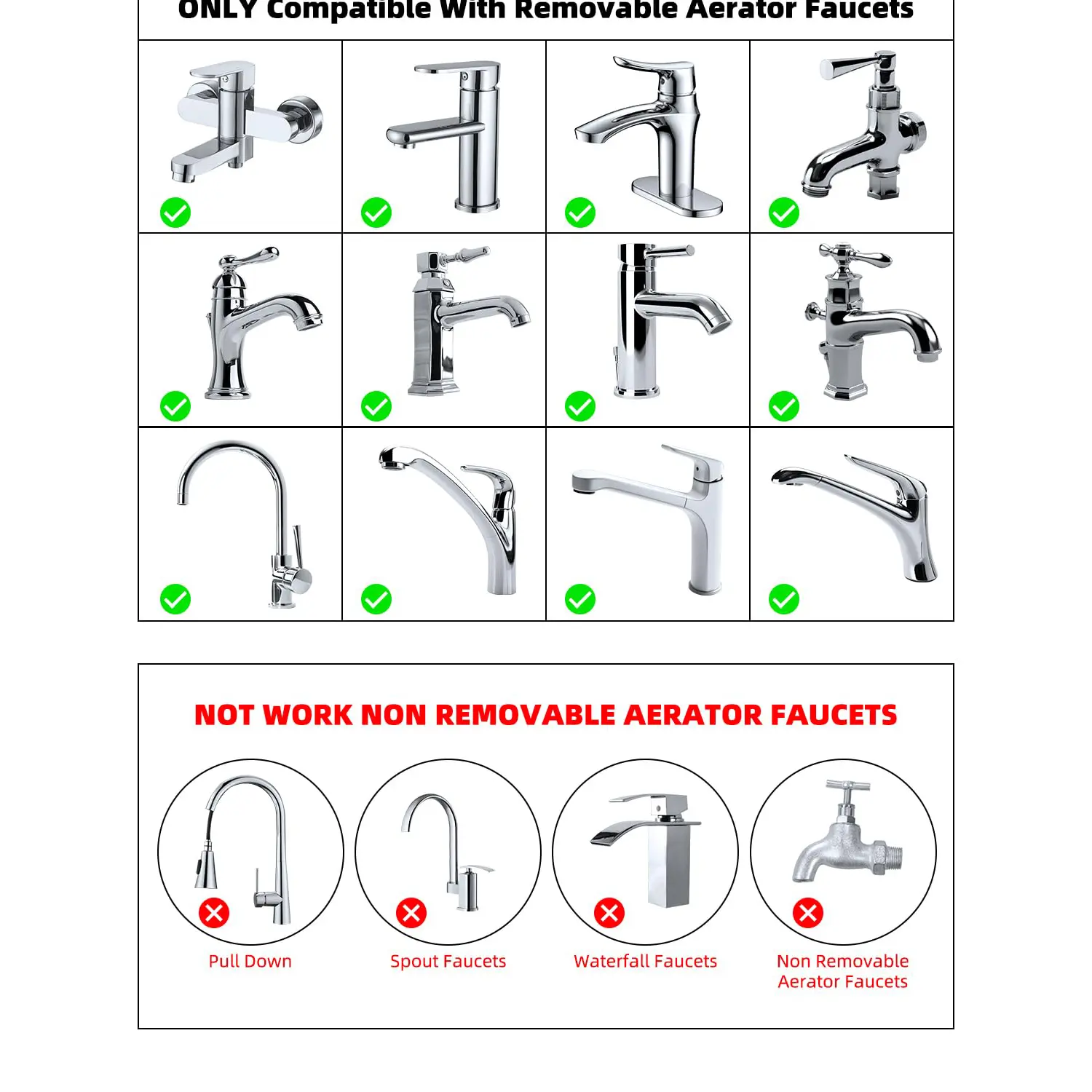 ·[Hose Adapter Kit for Garden] The Garden hose to faucet adapter has 55/64 inches x 27 female thread to standard 3/4-Inch male hose thread connected to the garden hose or 55/64 inches x 27 male thread connected to faucet aerator. The 3/4 inches standard male hose thread allows connecting the faucet to the hose aerator adapter. This faucet adapter is only compatible with sink faucets with removable aerators and didn't fit for shower hose and shower head.