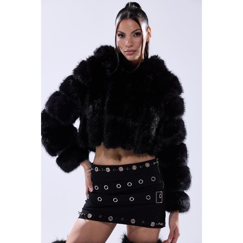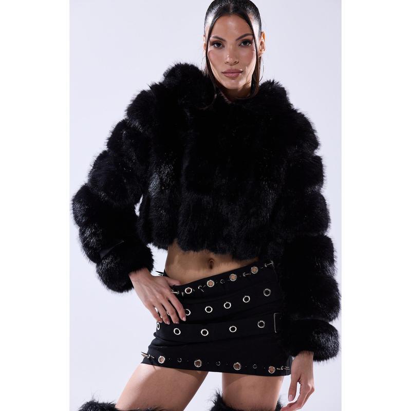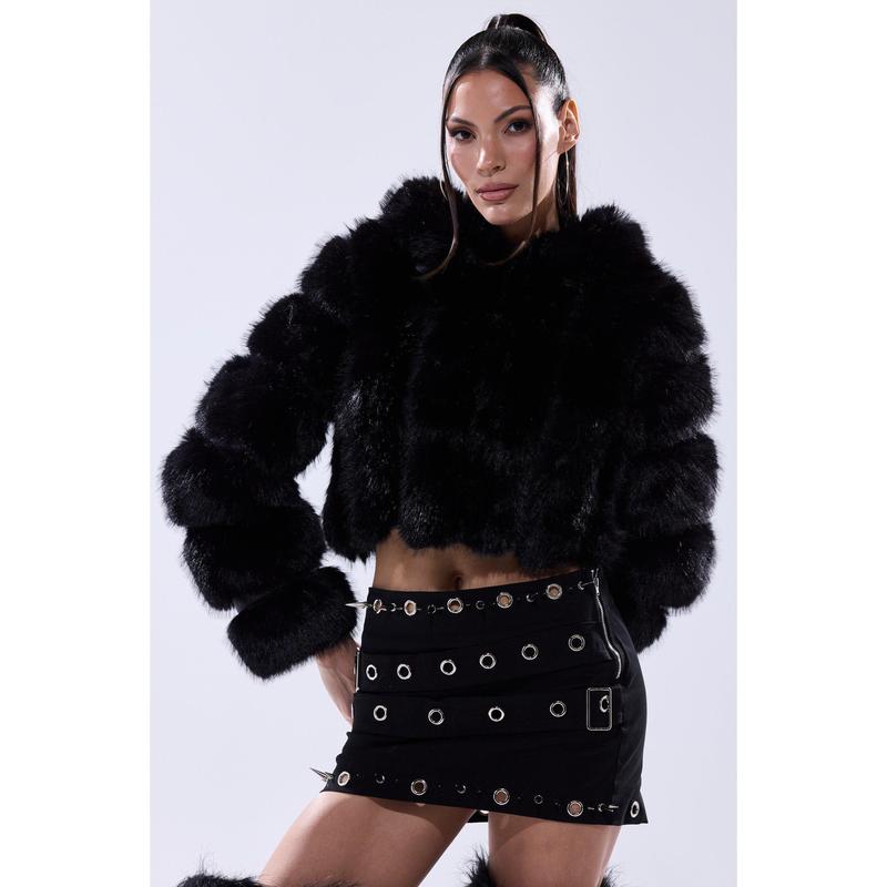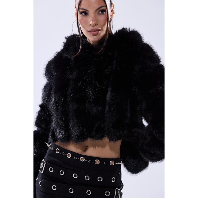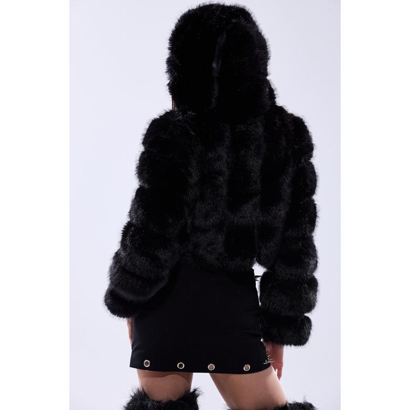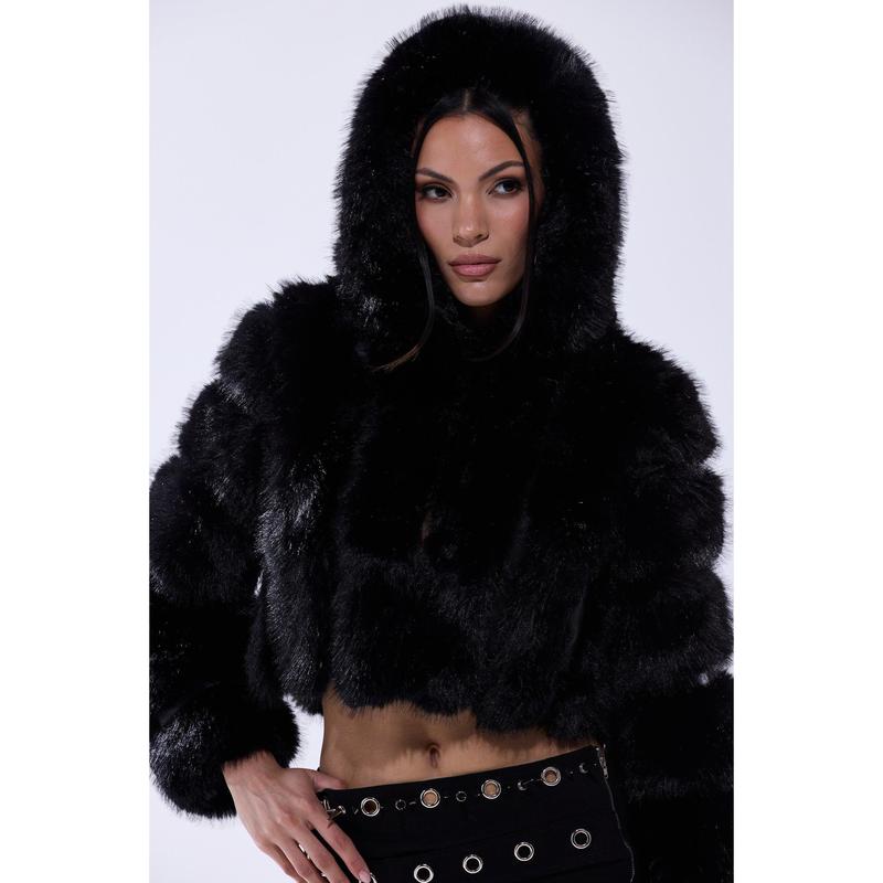 Stay warm and glam this winter in The AKIRA Label Jolene Faux Fur Coat in Black. This chic little coat is crafted from a soft faux leather base and features a plush faux fur exterior, an attached, sherpa-lined hood, spacious waist pockets, slick interior lining, and concealed hook and eye front fastenings. Style with a mini skirt, knee-high stockings, and platform booties for a luxe look. - Fur: 100% Polyester, Fabric: 67% PU, 20% Polyester, 13% Viscose - Wipe With Damp Cloth- No Stretch- Imported(all measurements approximate from size small)- 18” Shoulder to Hem- 15” Shoulder to Shoulder- 24” Sleeves- Model is 5’8” and is wearing size smallProduct ID: 433540(all measurements approximate from size 1X)- 20” Shoulder to Hem- 17” Shoulder to Shoulder- 25” SleevesProduct ID: 433544