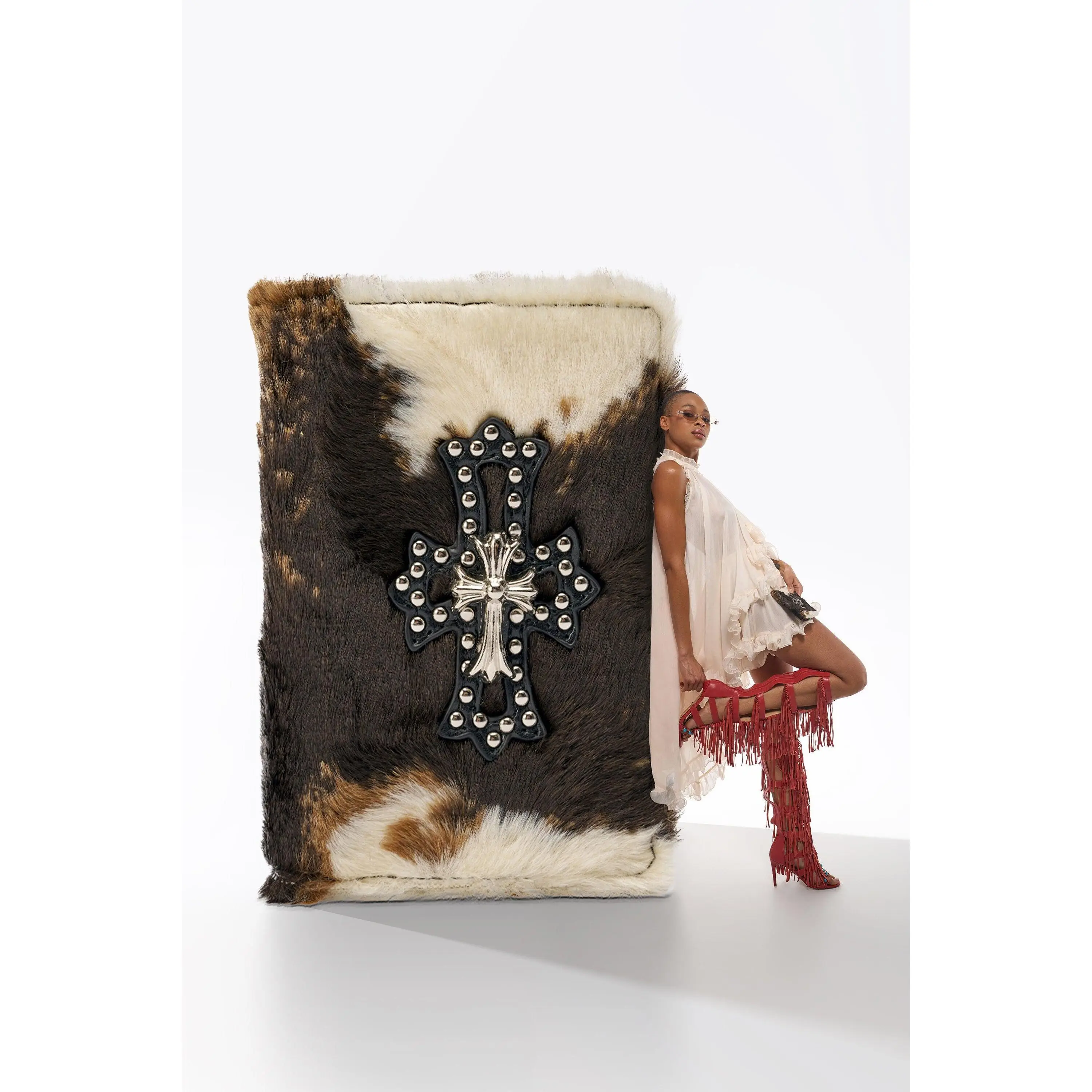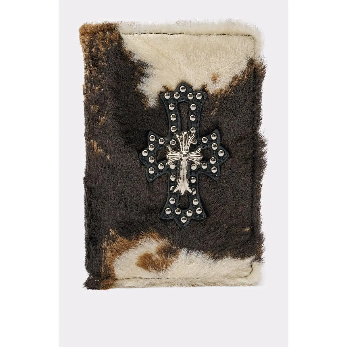 This faux fur cow print passport cover adds a luxe touch to your travel essentials adorned with a bold silver cross pendant and coordinating stud detailing on the front. Designed with a smooth leather-lined interior, it features four card slots plus an inner slip pouch to keep your passport secure and easy to grab on the go. - 95% Faux Fur 5% PU- Imported(all measurements approximate from size O/S)- 4” Length x 6” HeightProduct ID: 1085433