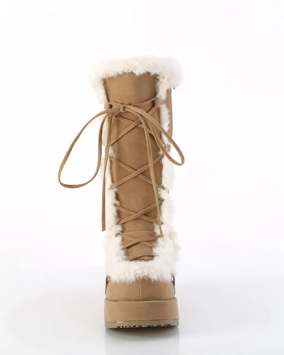 Introducing our vegan suede platform boots, the perfect addition to your winter wardrobe. These boots are designed to keep your feet warm and cozy during the colder months. The faux fur trim detail adds a stylish and cozy touch to the boots, making them a great choice for any occasion.