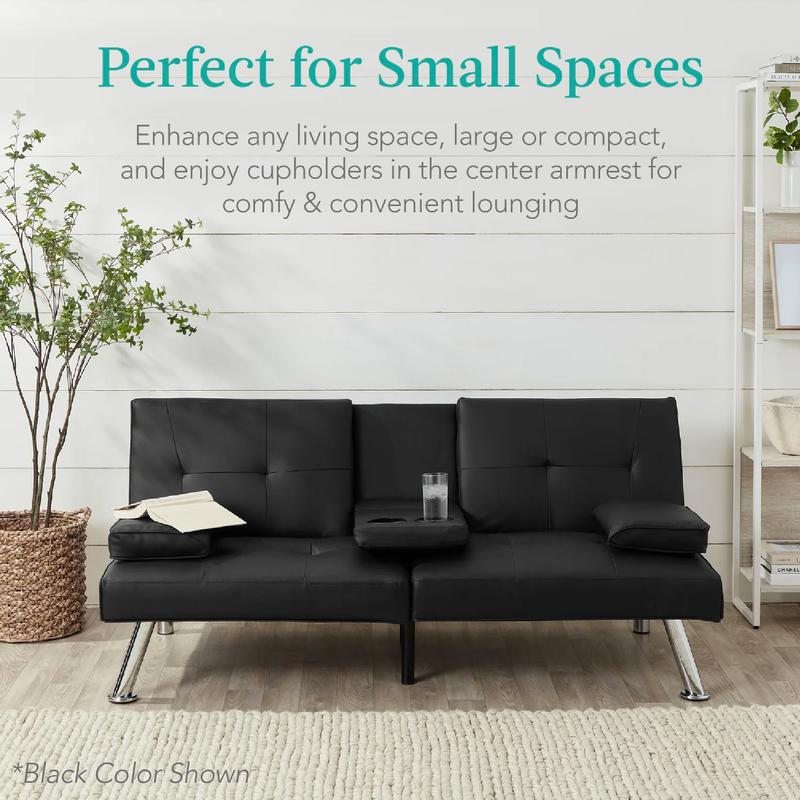 ROOM FOR 2: This stylish futon sofa has a 500-pound weight limit that lets you lounge in good company while utilizing a fold-down armrest with convenient cupholders in the middle