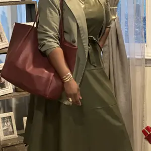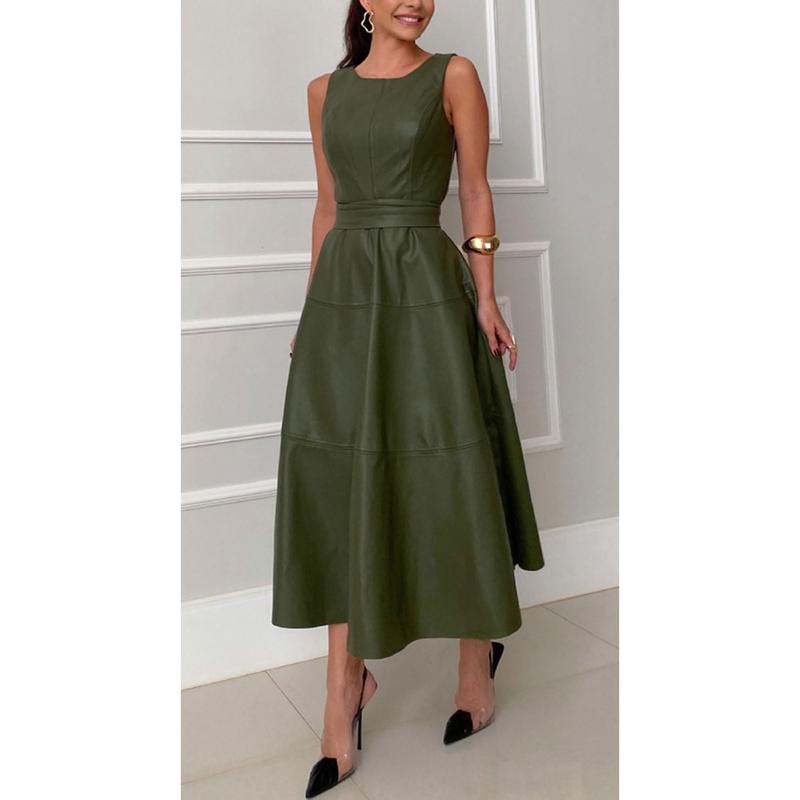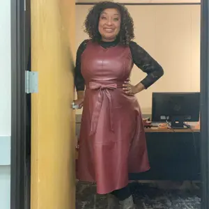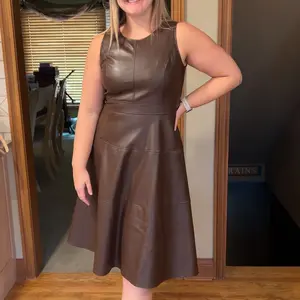 Love this dress. The faux leather is soft and flowy, not stiff, and the belted waist is very flattering. I’ve styled it casual, for work, and dressed up for dinner. One dress, so many looks—worth every penny.