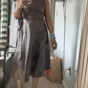 I'm not sure if this dress is real leather or not. But it fit beautifully. My lady truly loved it. No complaints here. Excellent quality color looks even better in person.
