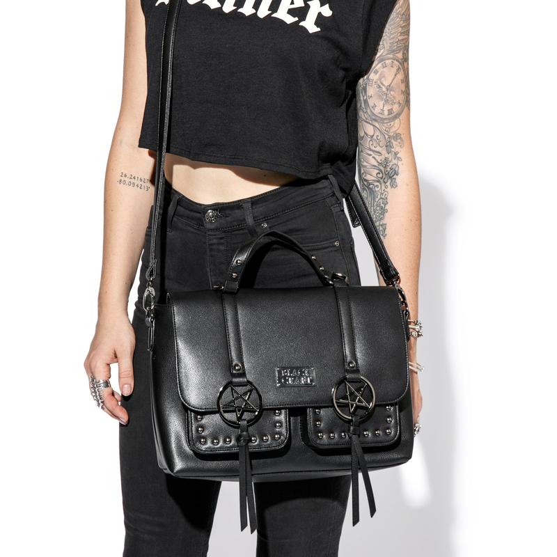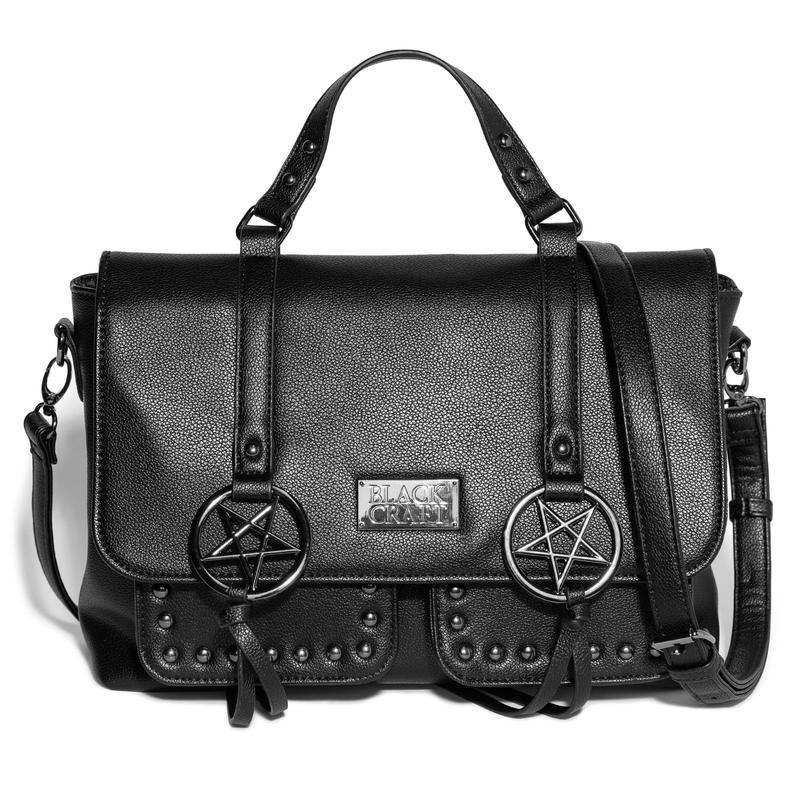Our best-selling faux leather messenger bag with gunmetal finish pentagrams and Blackcraft logo plaque. 46" adjustable removable crossbody strap included. Interior features 1 zip pocket, 1 slit pocket and custom interior lining.