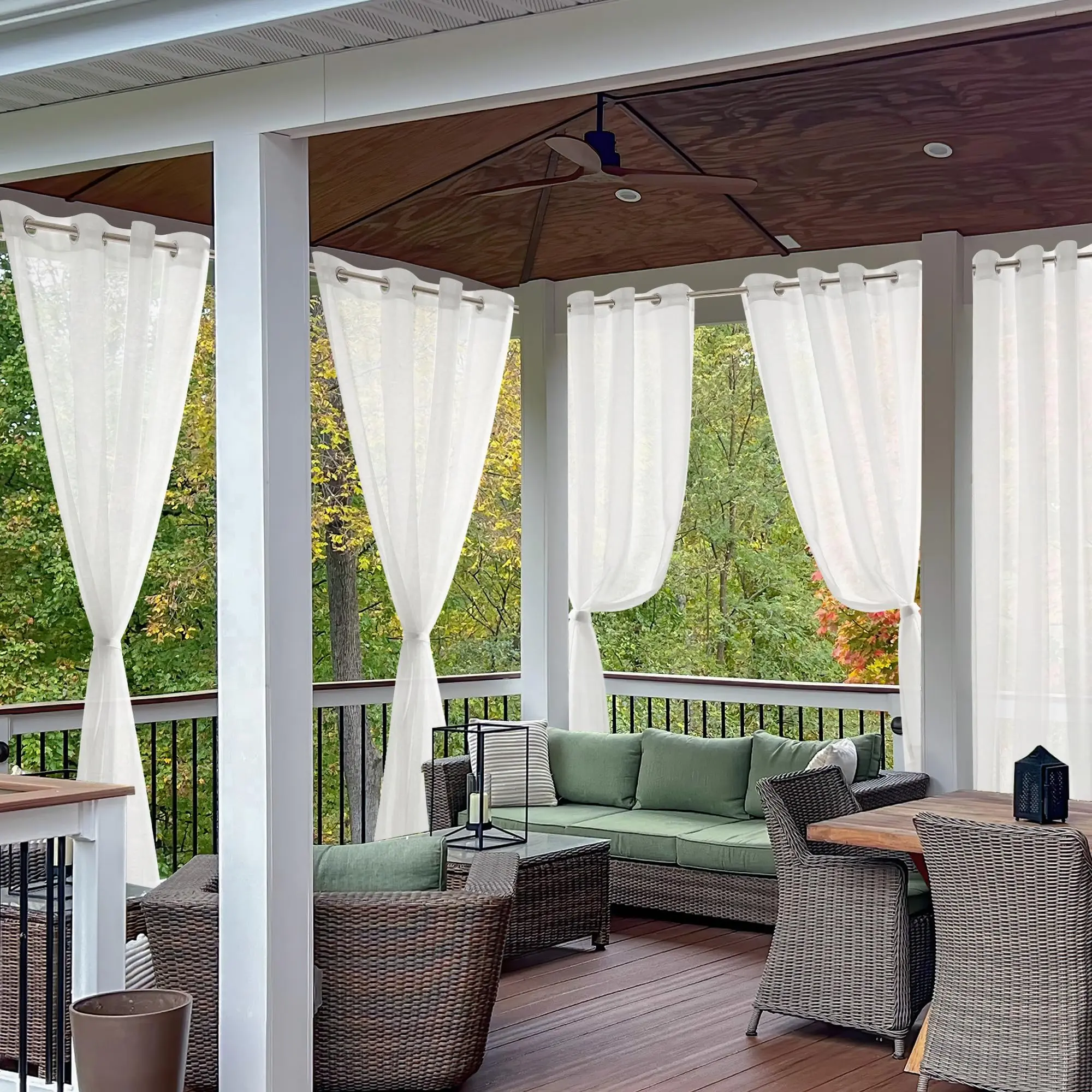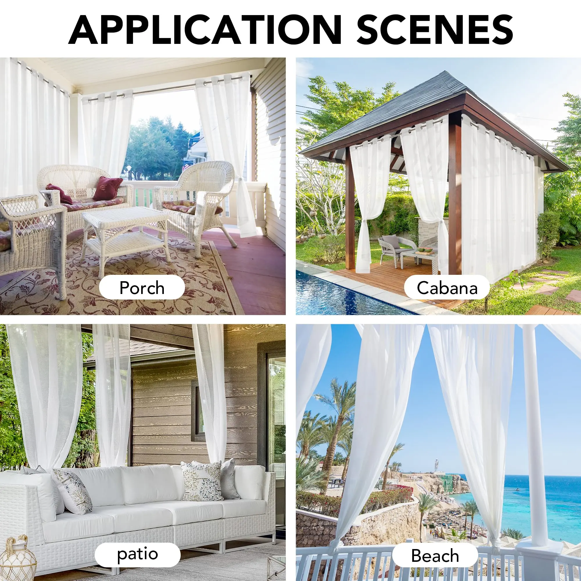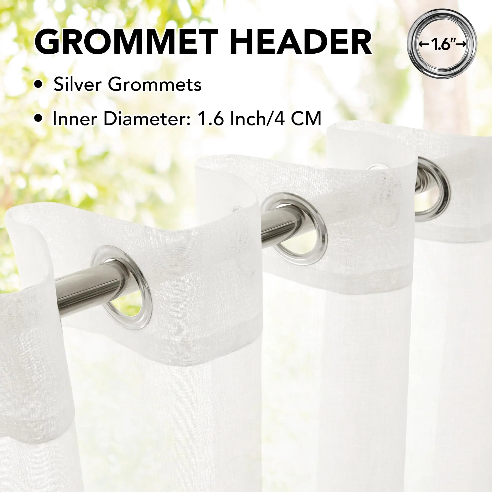 ·BASIC INFORMATION: Each package includes 2 waterproof outdoor sheer curtain panels with 16 silver grommets on each panel for easy installation.