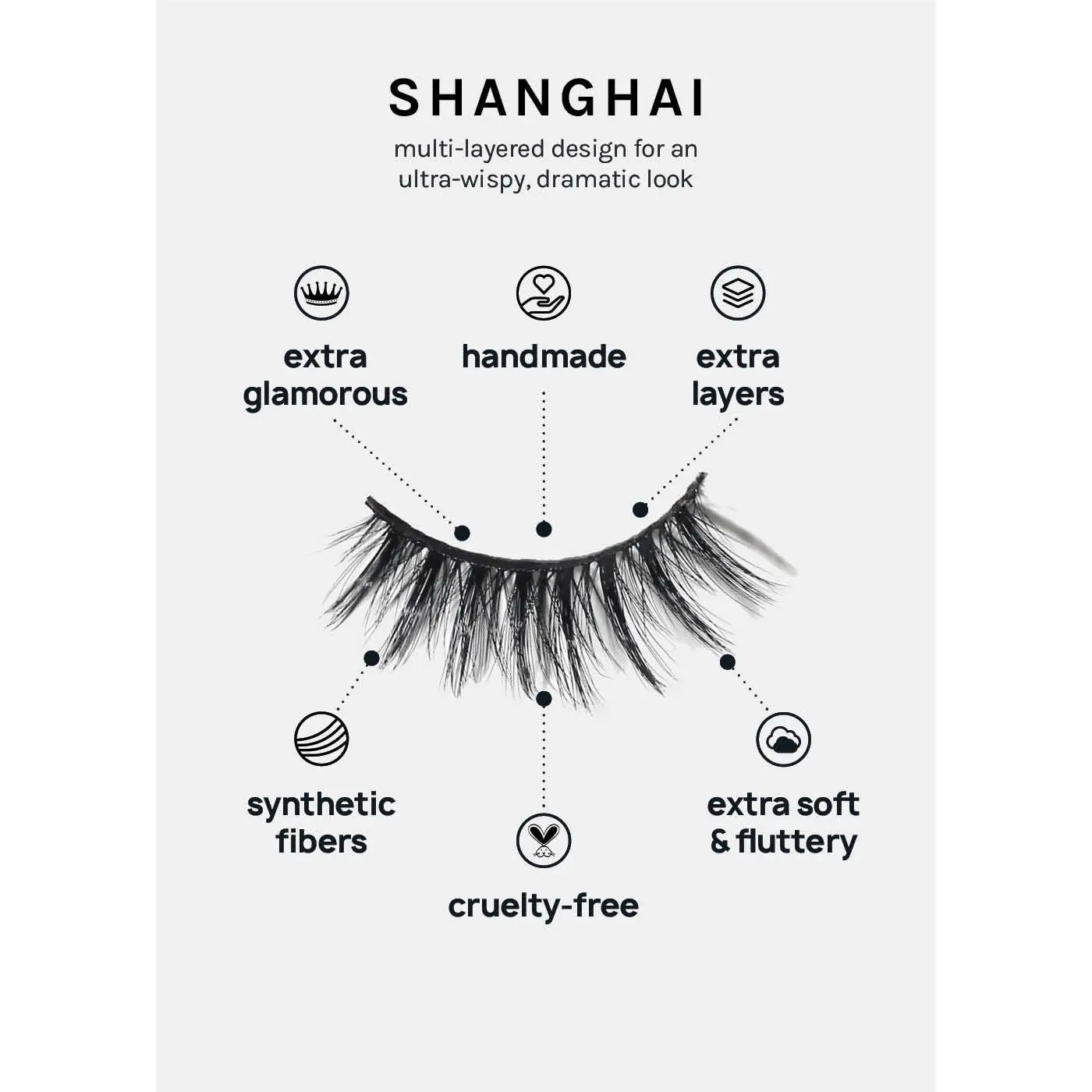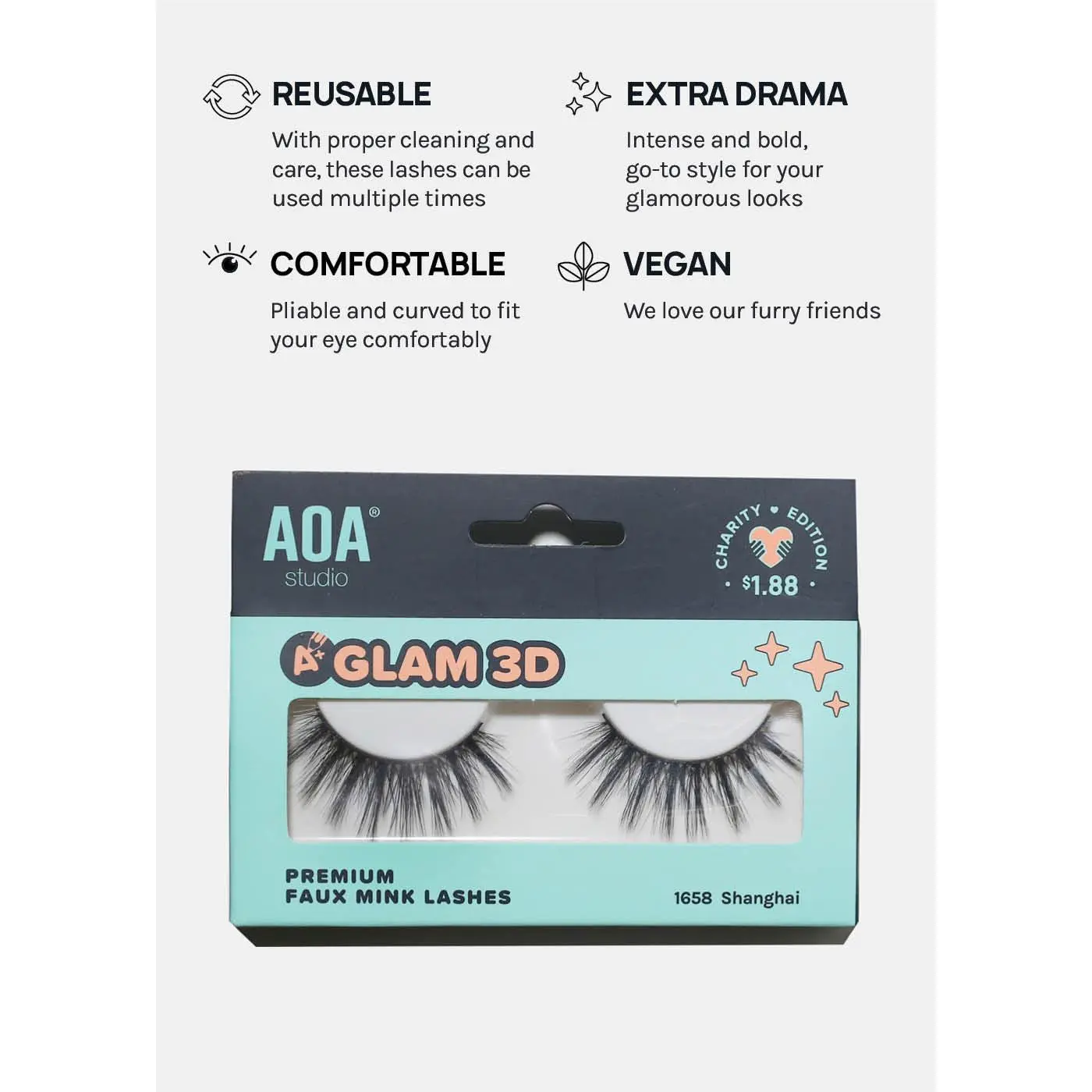GLAM, super WISPY, + stacked, A+ Glam 3D Faux Mink Eyelashes are 100% Vegan fiber layered to add fluttery length + volume to all eye shapes. Features a wide lash band to last multiple wears.
