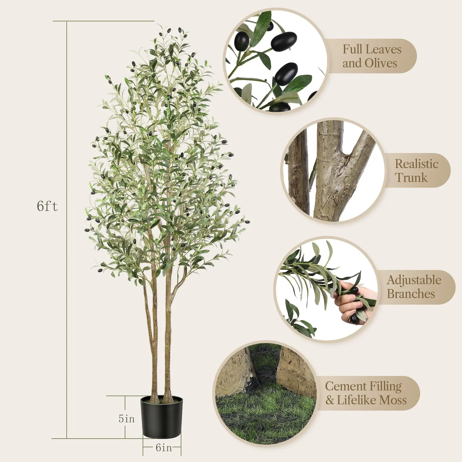 ·【Realistic and Adjustable】:Experience realism and versatility with our lifelike Faux Olive Tree, Size: 4/5/6/7FT -- featuring 576/936/1224/1512 leaves and 32/52/68/84 fruits for a natural appearance. Adjustable branches allow effortless customization to fit any living space. Built with a sturdy metal structure and soft metal wire in the trunk and leaves.