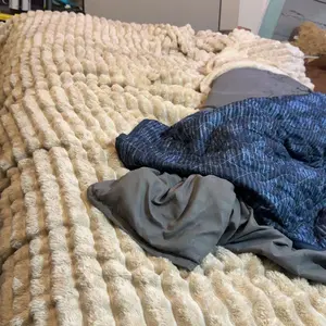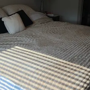 I was very disappointed with this blanket. The photos made it appear thick, plush, and cozy but the one I received is actually very thin. In some areas, the lines are even see-through, which definitely wasn’t shown or implied in the advertisement. I expected a much thicker, higher-quality blanket based on the promotional images, so this was a letdown.