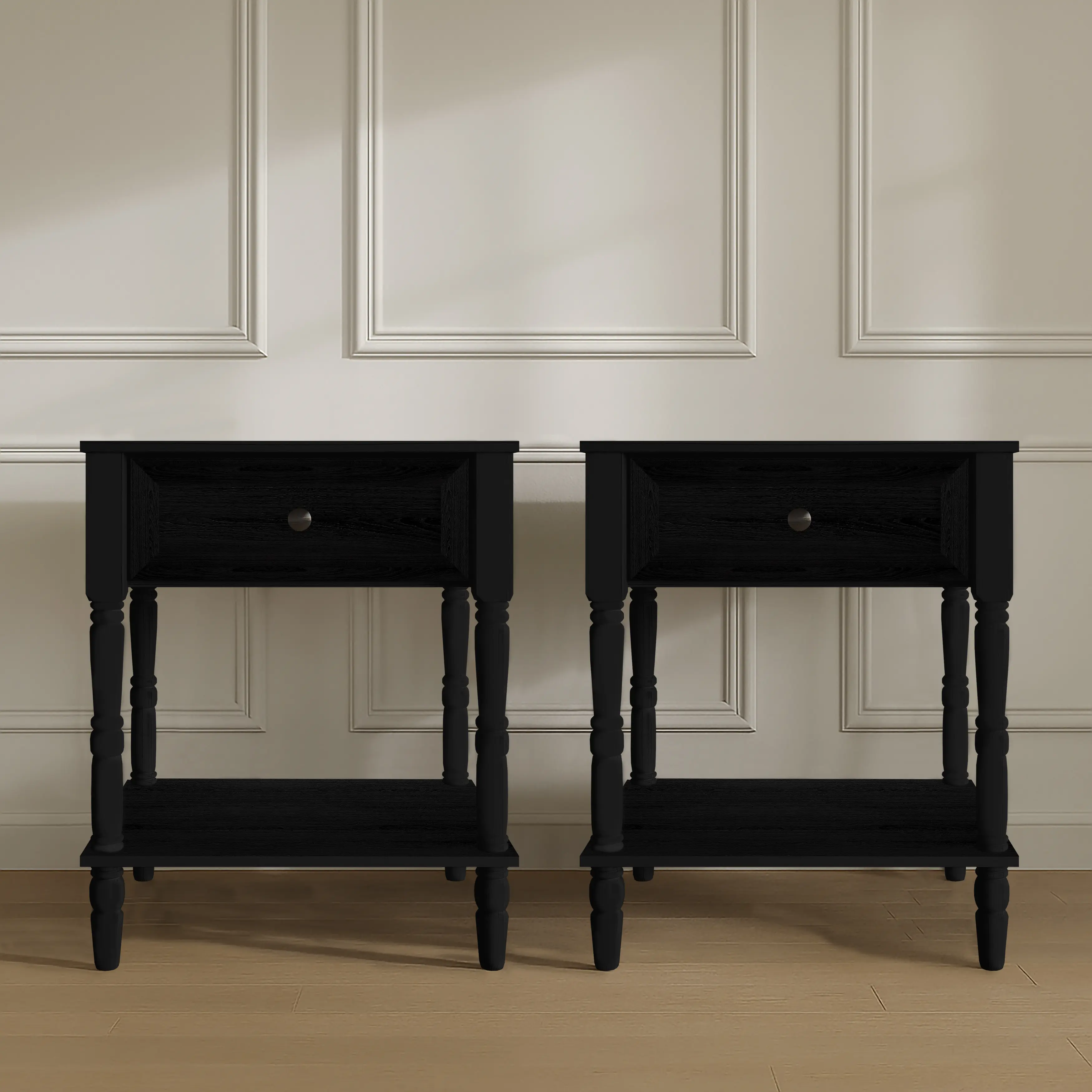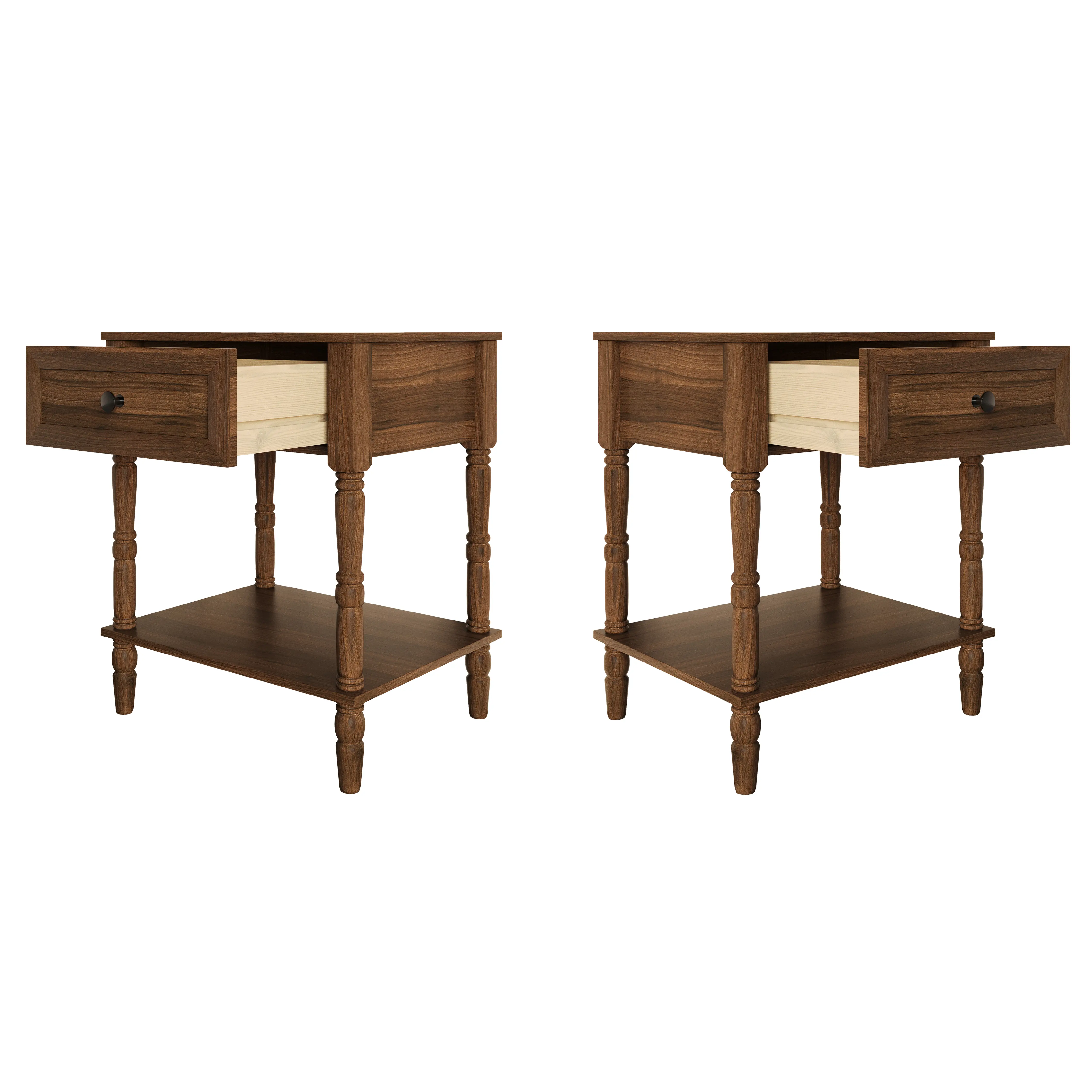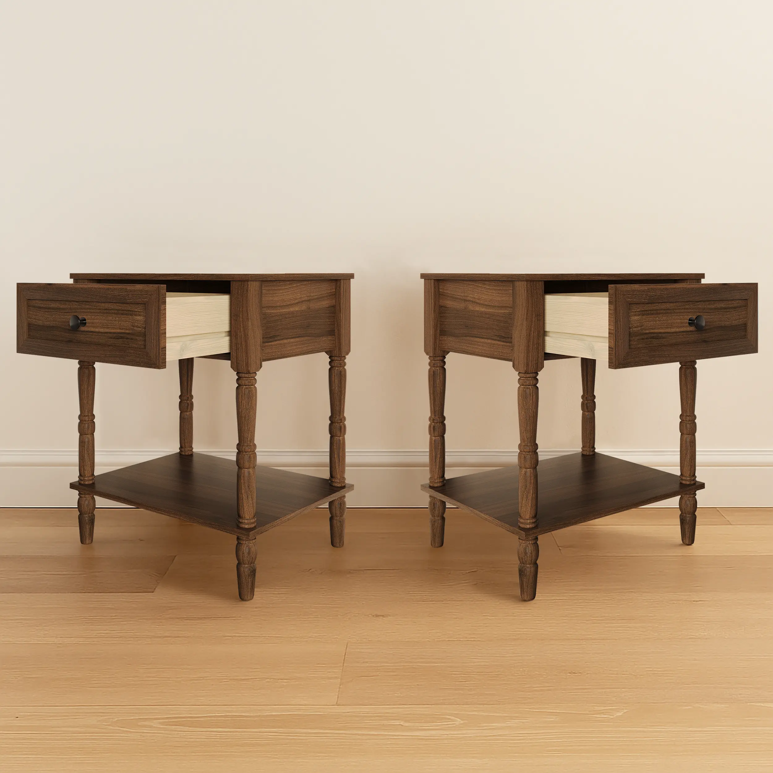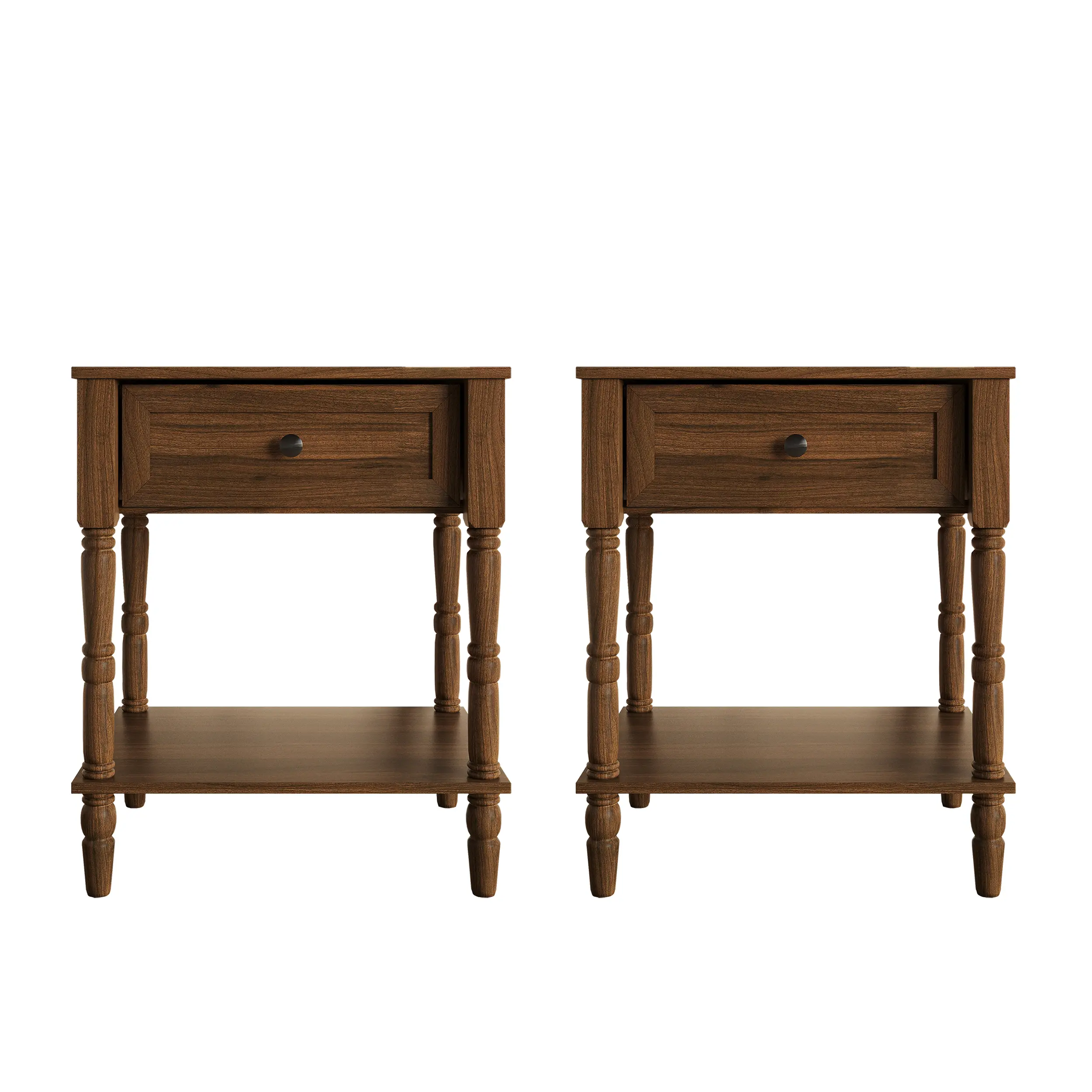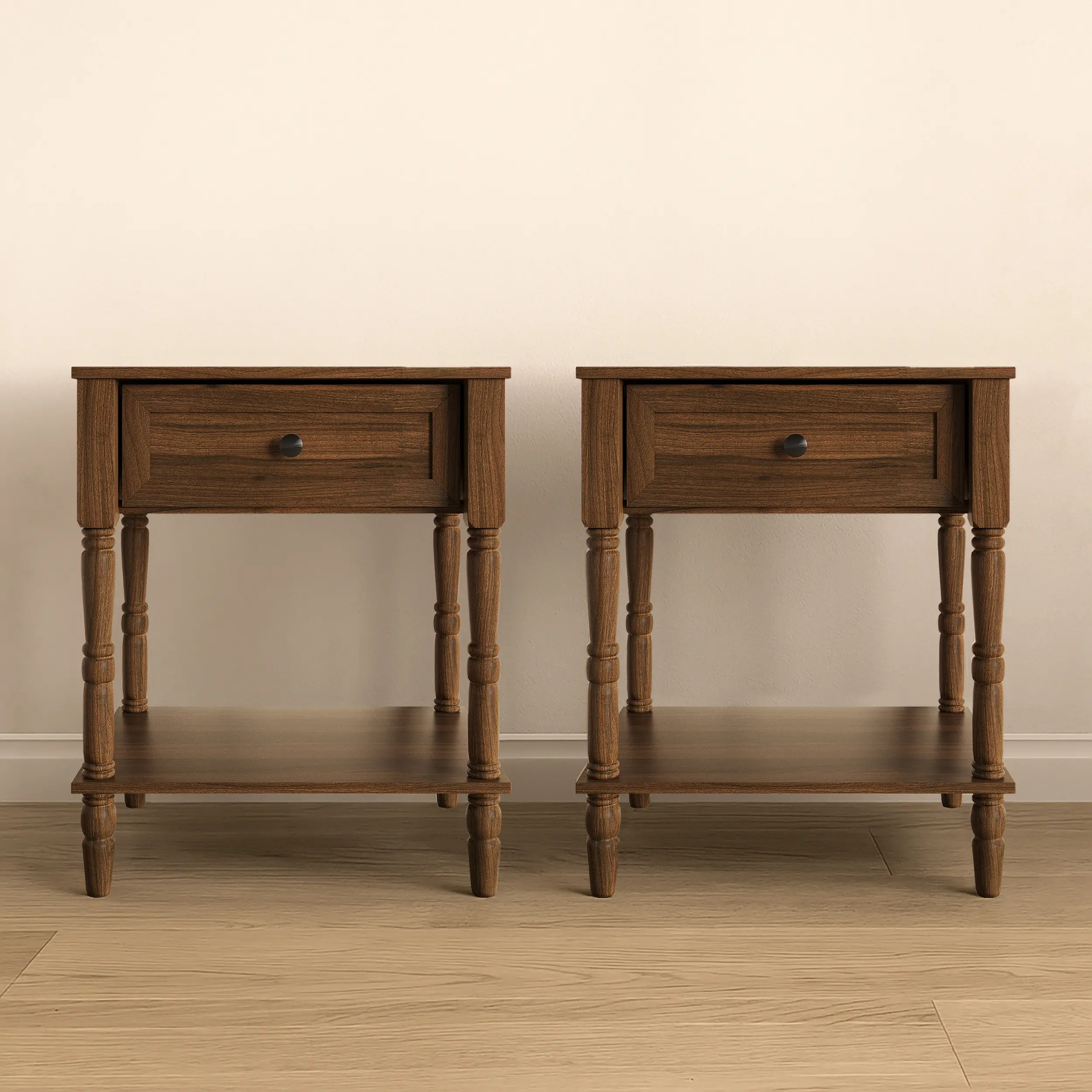 This nightstand features a vintage-inspired design, perfect for traditional and transitional bedrooms. The rich woodgrain finish adds a touch of elegance and timeless character. Beautifully turned legs enhance its aesthetic appeal. 🪵