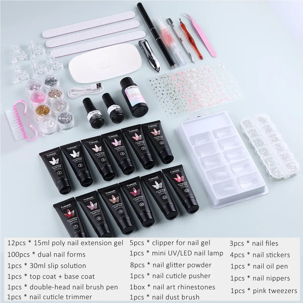 ·【Nail Art Kit With Everything】 You will receive 12pcs * 15ml poly nail extension gel,100pcs * dual nail forms,1pcs * 30ml slip solution,1pcs * double-head nail art brush,5pcs * clipper for nail gel,1pcs * top coat + base coat,1pcs * 6W mini UV/LED nail lamp,8pcs * nail glitter powder,4pcs * nail art stickers,1pcs * nail oil pen,3pcs * nail files,1pcs * pink tweezers,1box * nail art rhinestones,1pcs * nail cuticle pusher,1pcs * nail cuticle trimmer,1pcs * nail nippers,1pcs * nail dust brush