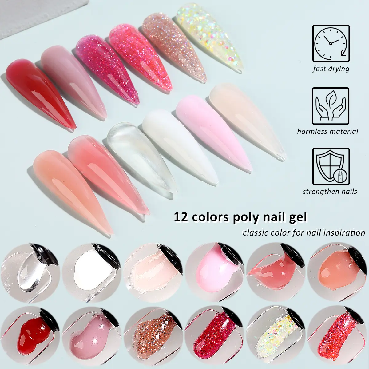 ·【Basic Poly Gel Nail Art Tools】 This nail builder gel set includes all kinds nail art tools for nail extension. Dual forms,nail clippers,nail brush...You can also find nail glitter powder set,which can allow you to mix with the nail gel and create beautiful ombre glitter nail design.