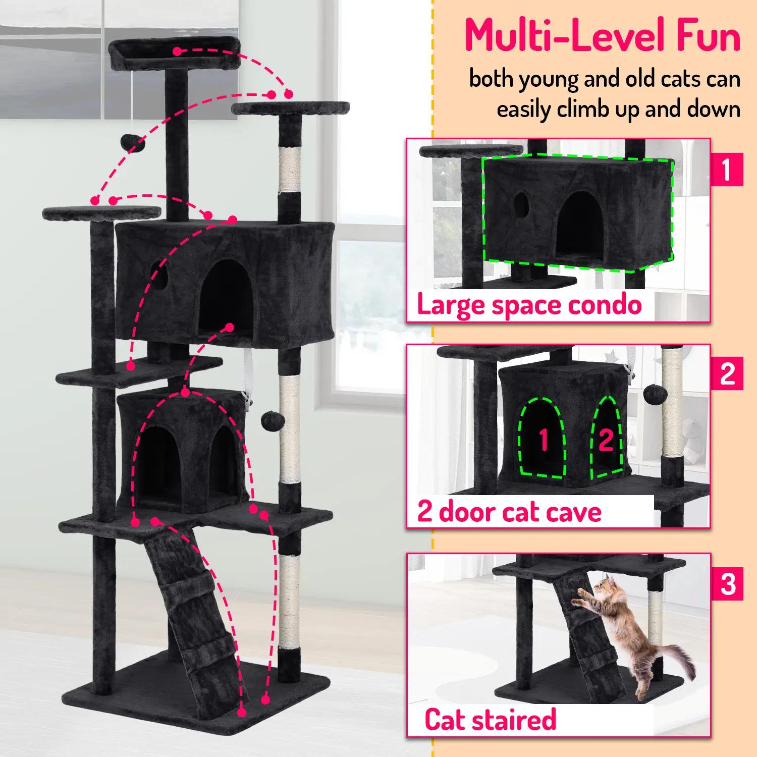 The cat tree offers 3 spacious perches and 2 cozy condos. Kittens can stretch out on the perches, curl up in the plush holes, or scratch on the sisal pole. This tower ensures your cat's day is filled with fun and excitement. Two toys add extra play fun! 🎭