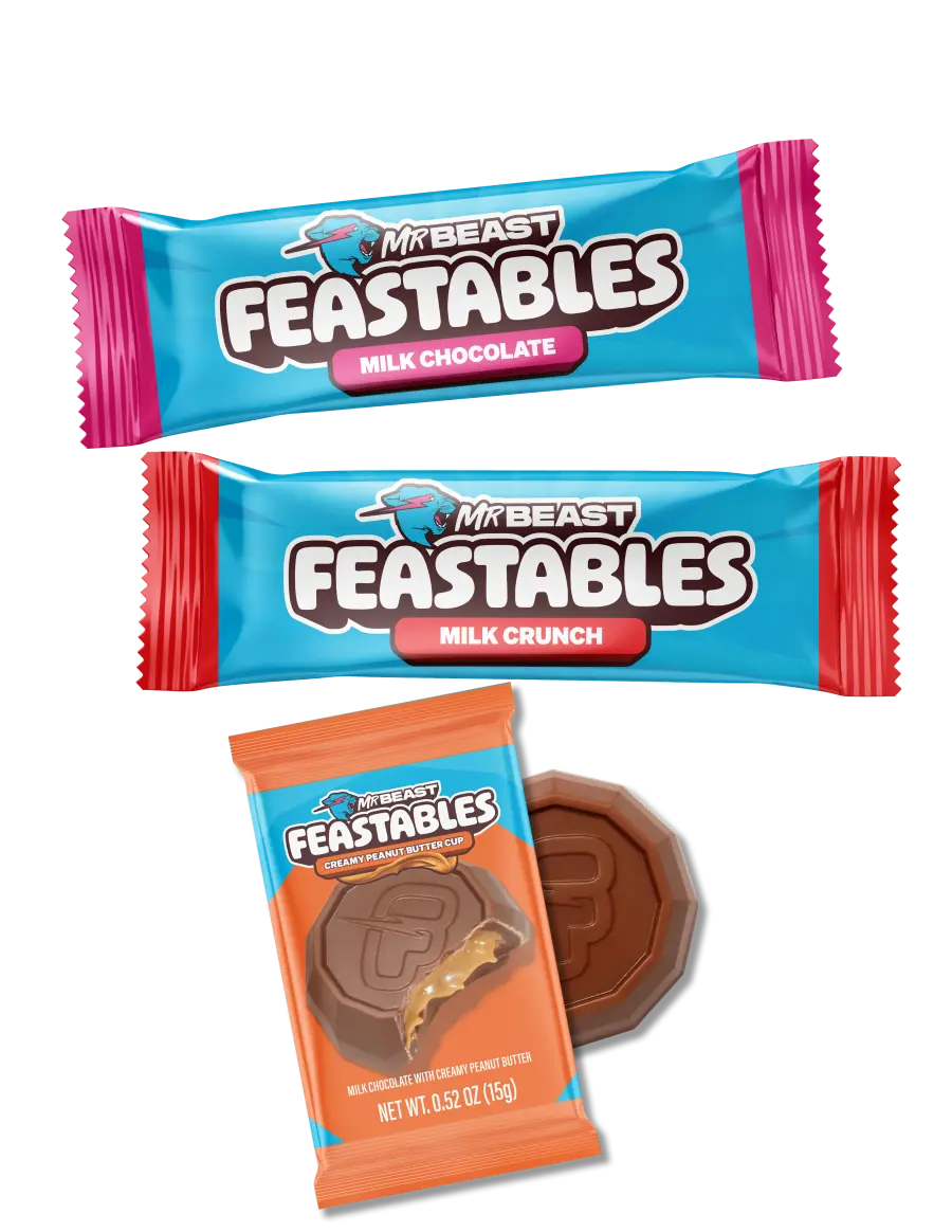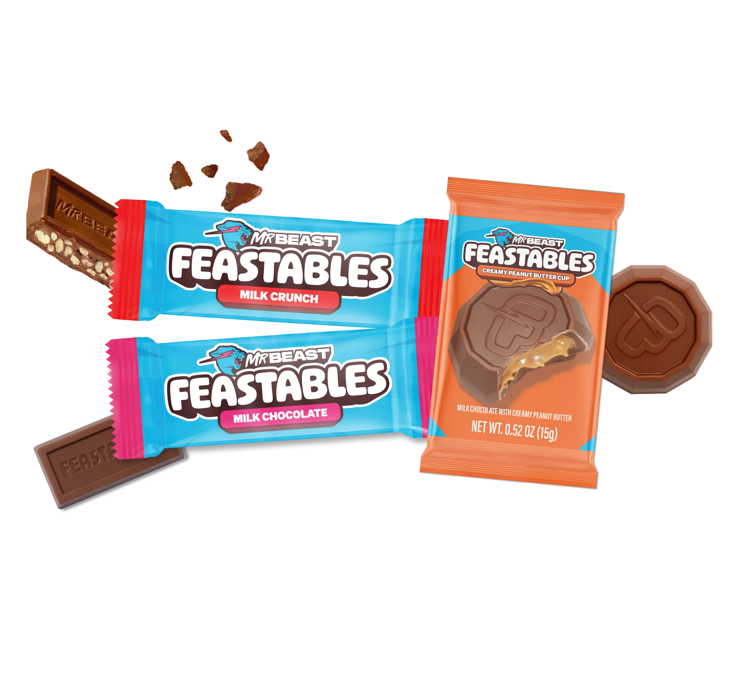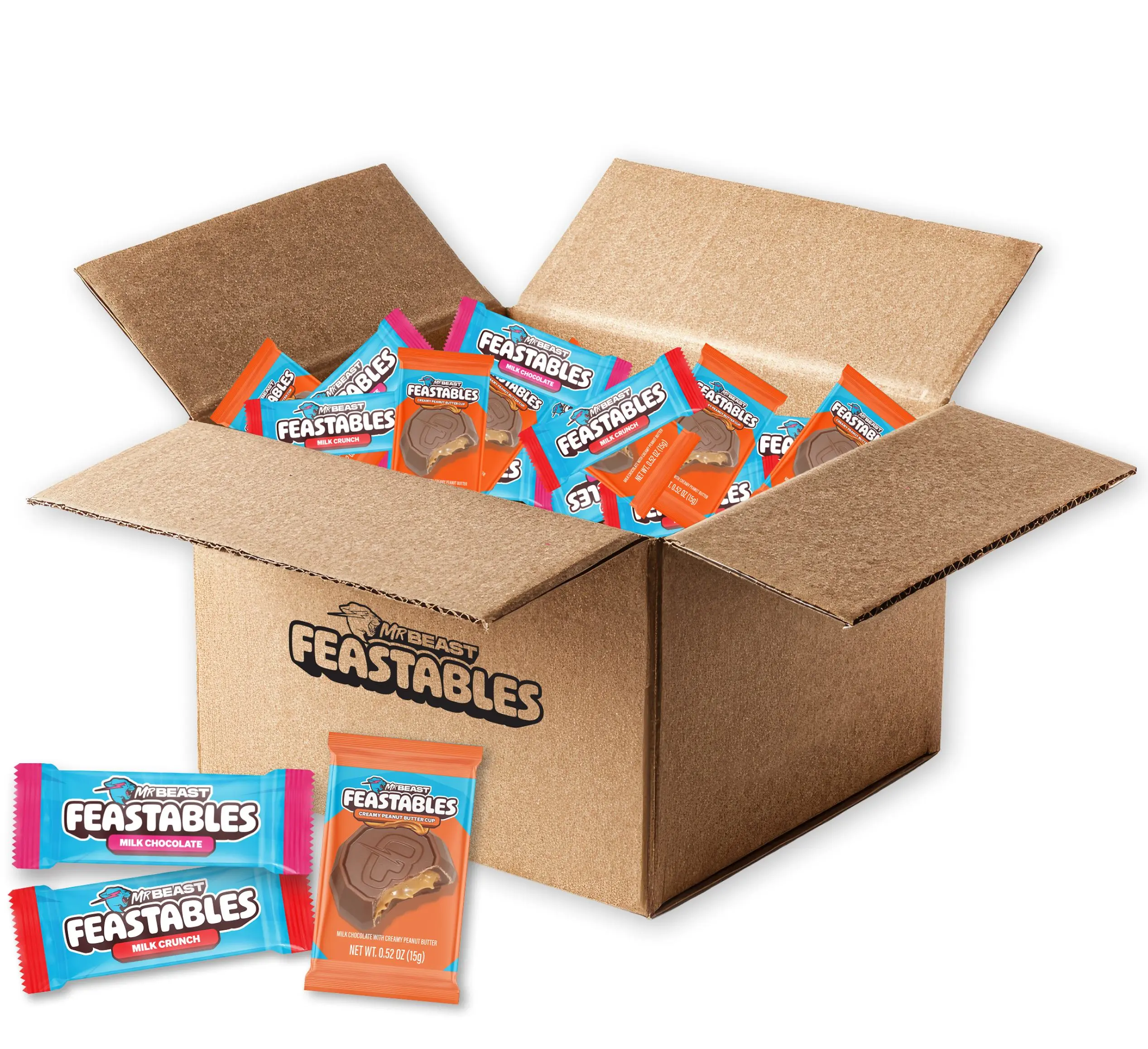The Ultimate Feastables Lineup: Individually wrapped snack-size chocolate bars and peanut butter cups in one epic box.