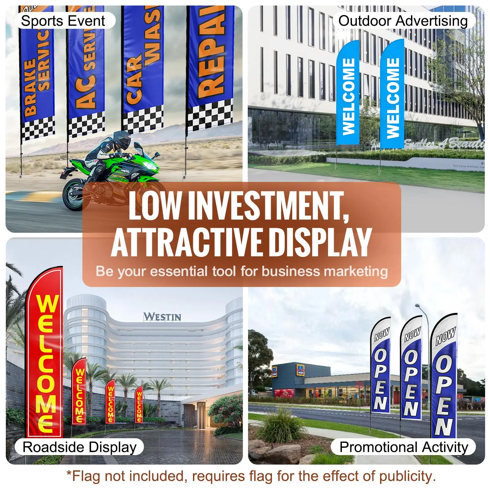 • Cost-Effective Marketing Tool: Ideal for various feather or teardrop flags, these banner flag poles suit various commercial and event settings. It is a cost-effective choice for increasing brand visibility in outdoor activities, retail storefronts, or busy streets.