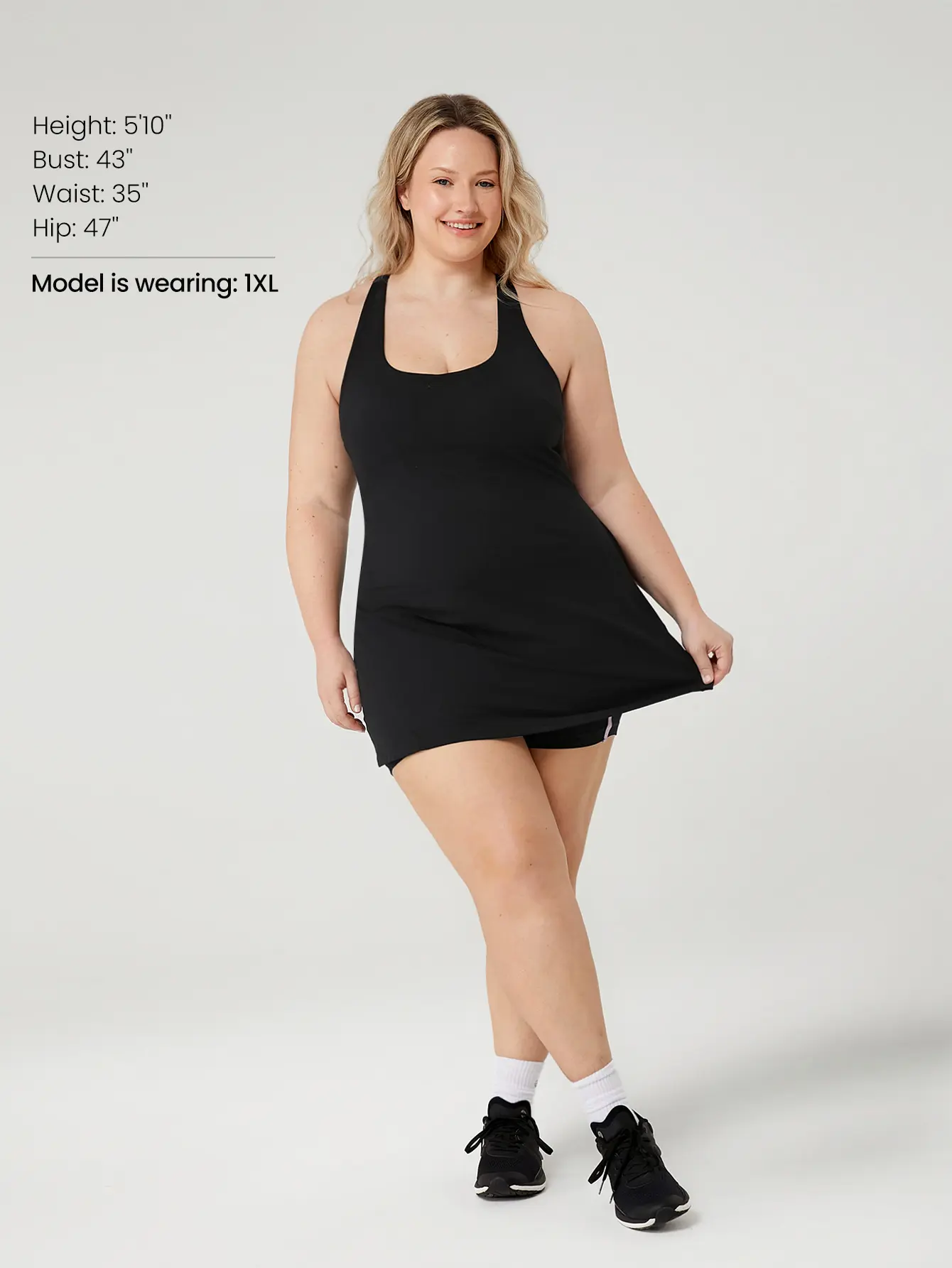 GlowMode’s plus size workout dress has smoothing fabric, hidden pull-down shorts, built-in pockets, and bra support. It’s the only dress that gets what we need. #glowmode #plussizefitness #plussizeactivewear #over40style #activewearhaul