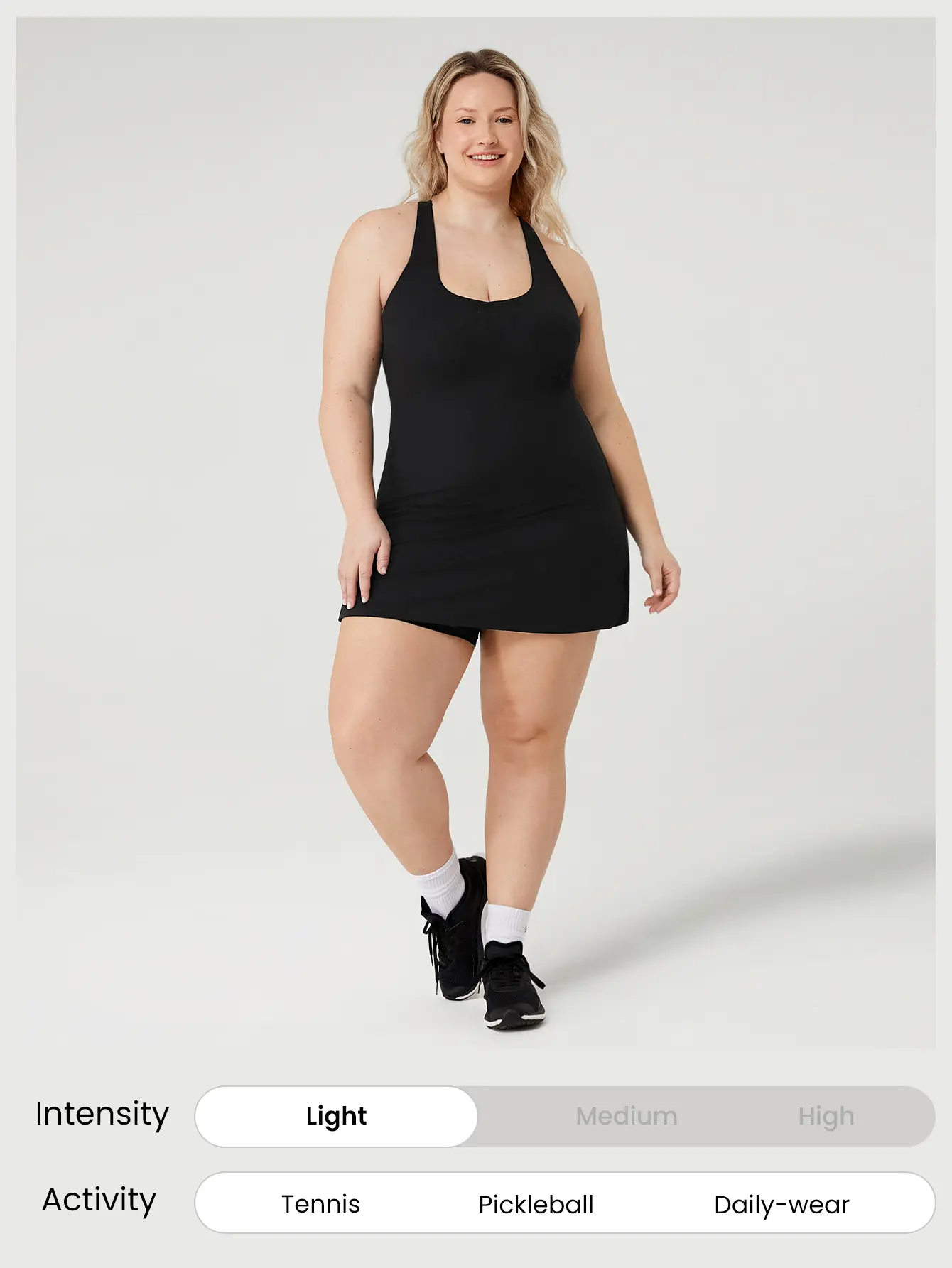 Tips: Due to packing and shipping, your FeatherFit item may arrive creased. This can be easily removed by washing or steaming before wear. Pro Tip: Designed for light support and low-impact activities, from Downward Dog to dog walking.Merge fashion and function with this buttery-soft FeatherFit-Air plus dress. It's crafted with high elasticity for all-day support , making it perfect for medium-impact sports. This scoop neck style features x-strap backs for increased movement, adjustable shoulder straps, and a built-in jumpsuit with pocketed shorts you can pull down without removing the entire dress. Anti-slip strips at the leg opening prevent the shorts from riding up during movement.