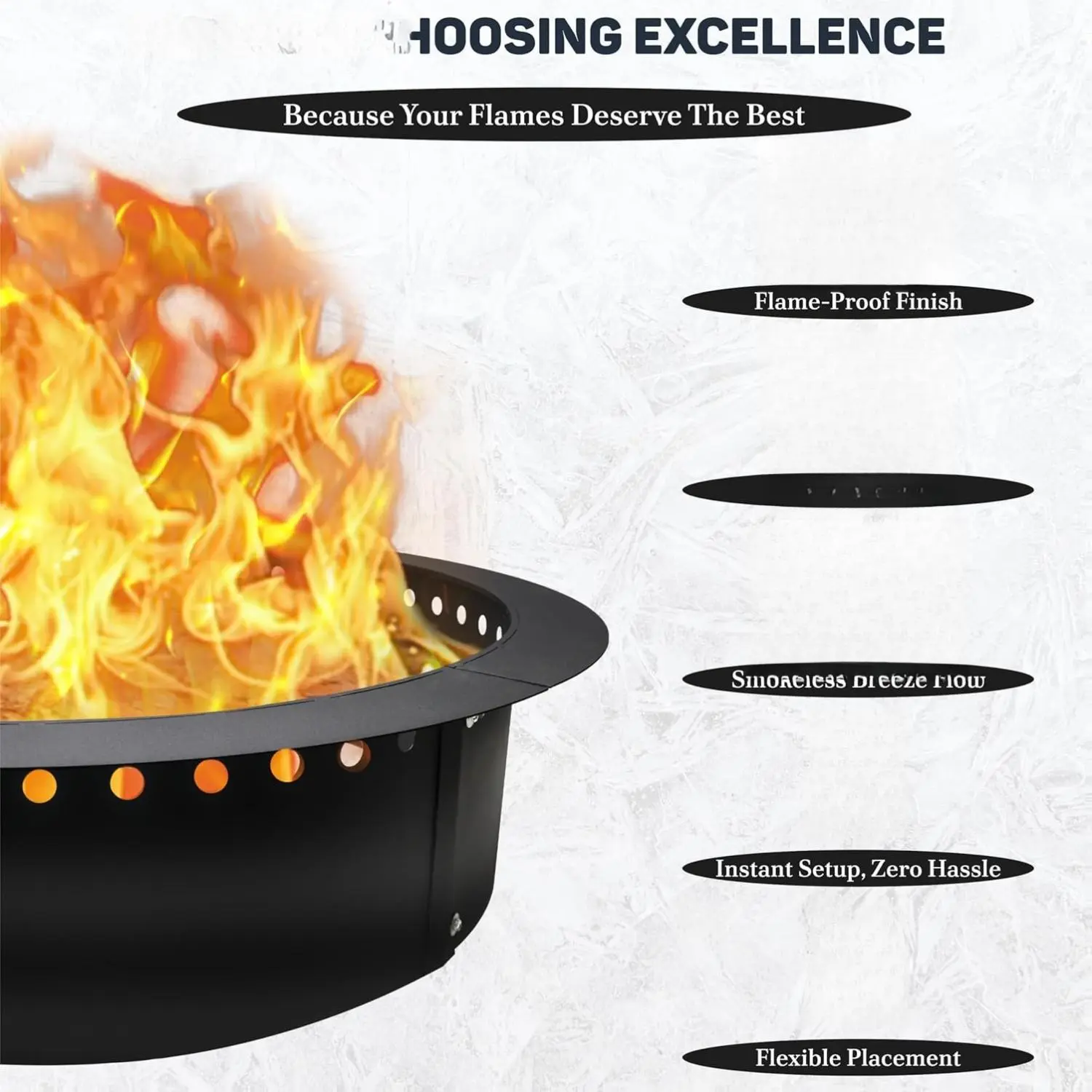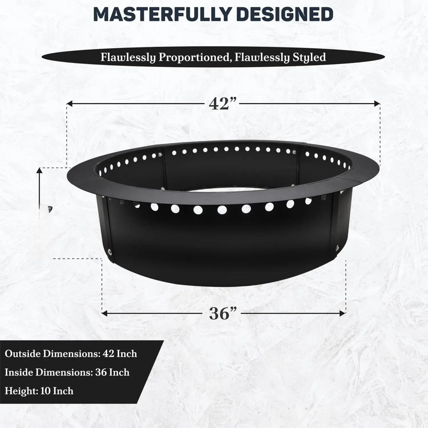·With a 42" outer diameter, this ring offers a spacious and smoke-reducing feature. Advanced airflow technology provides a larger, more efficient burn. Enjoy a cleaner, more enjoyable bonfire experience with reduced smoke.