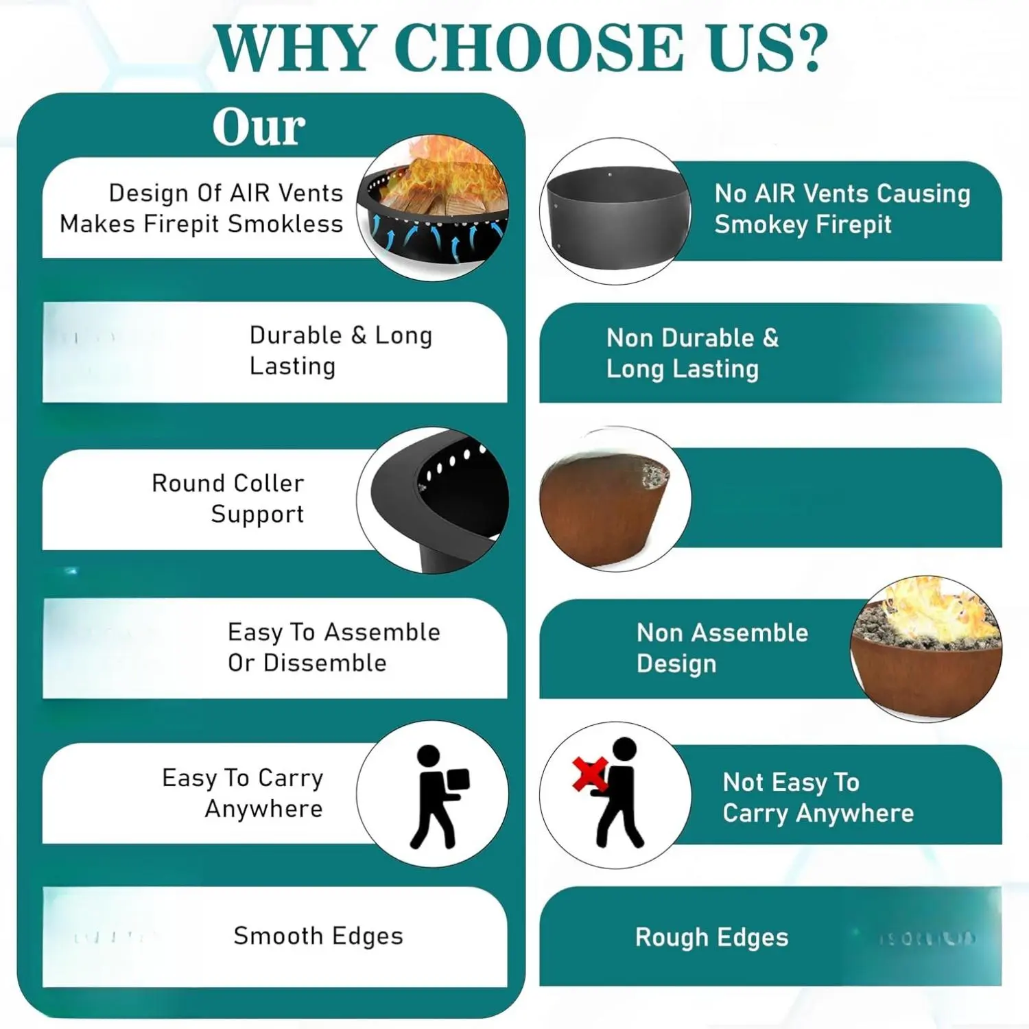 ·Smooth edges reduce the risk of accidental cuts or injuries when handling or assembling the fire pit!