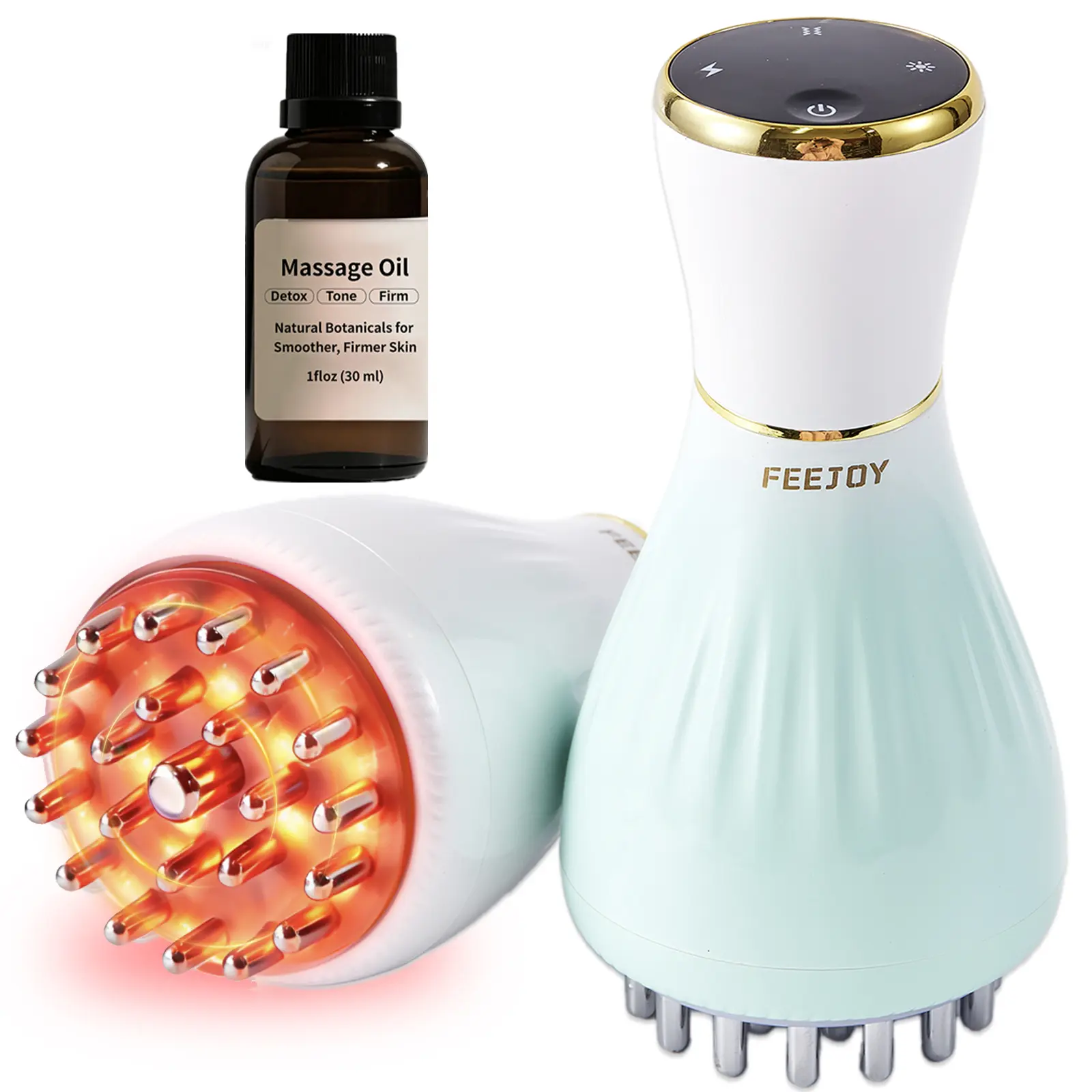 FEEJOY Massage Oil (infused with caffeine, grape seed, and centella) to enhance glide and absorption during use. Pairing with the oil helps maximize the comfortable, refreshed feeling of each massage. Use 3–5 times a week for a noticeable improvement in skin texture and overall comfort. Please note: FEEJOY Massage Oil is sold separately and is not included with this product.