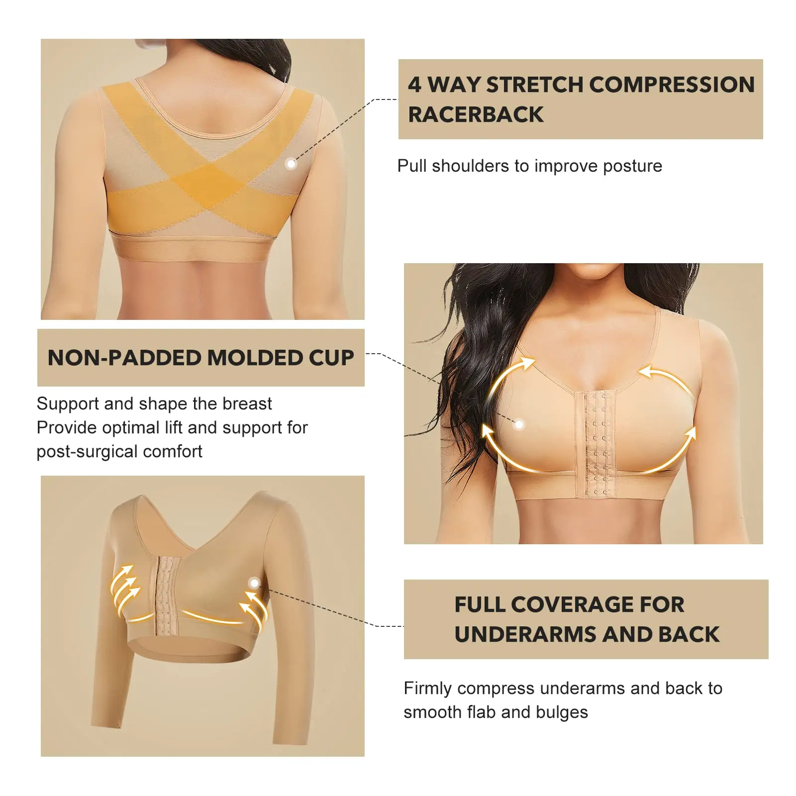 FRONT CLOSURE SUPPORT BRA. The 4 rows hook-eyes won’t dig in your armpit and stay in place while smoothing upper arms. Middle non-padded & chest side padded support design will provide even more security and comfort to your arms and breast.