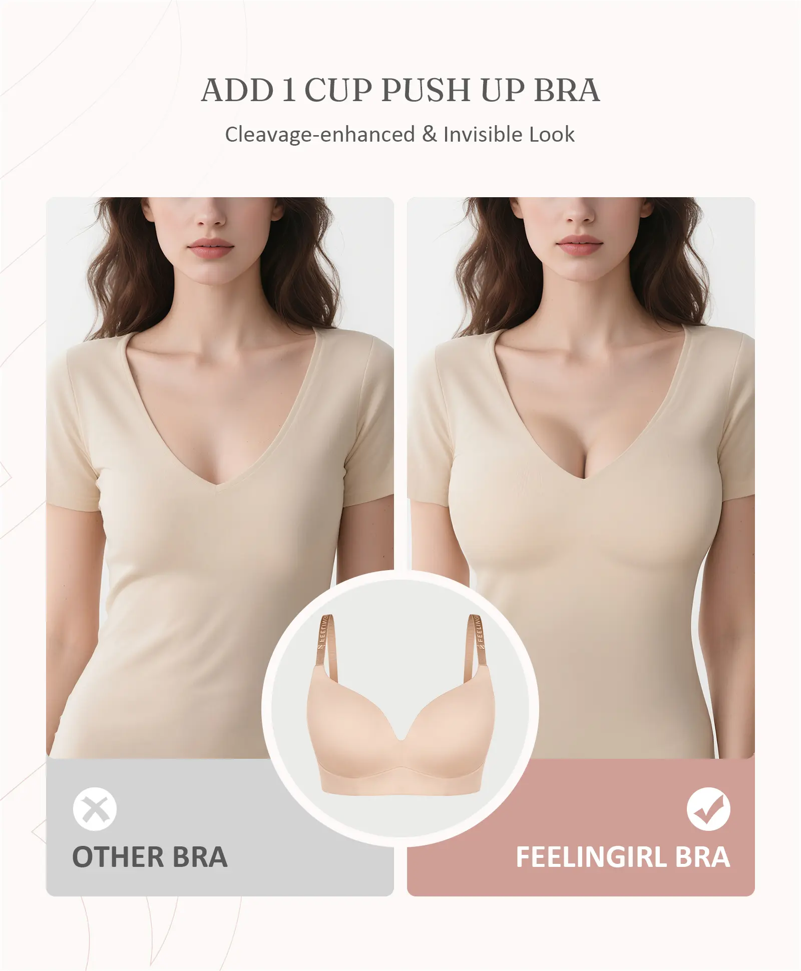 Our push-up T-shirt bras offer medium padding and moderate lift. They feature seamless, invisible technology that blends under clothing. The demi-coverage (3/4 cup) provides a flattering lower-cut look, staying invisible throughout the day. Perfect for those who prefer a natural, undetectable appearance.