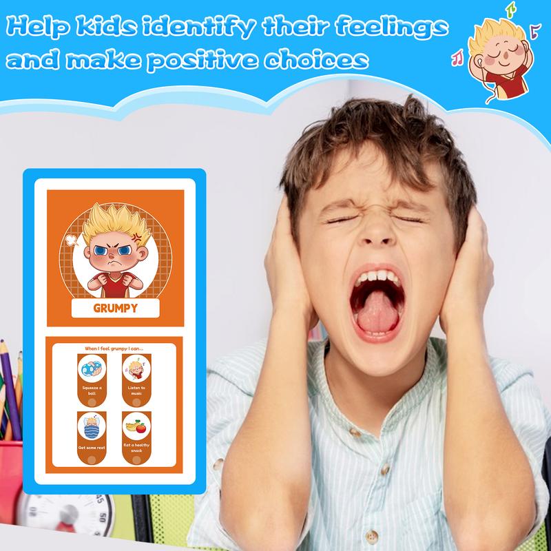Discover a wide range of emotions such as confused, ashamed, happy, disappointed, lonely, silly, angry, shy, jealous, scared, bored, supprised, loved, excited, proud, worried, tired, nervous, impatient, grumpy, embarrassed, sad. Kids will enjoy flipping to the character that reflects their current mood, along with positive actions they can take.