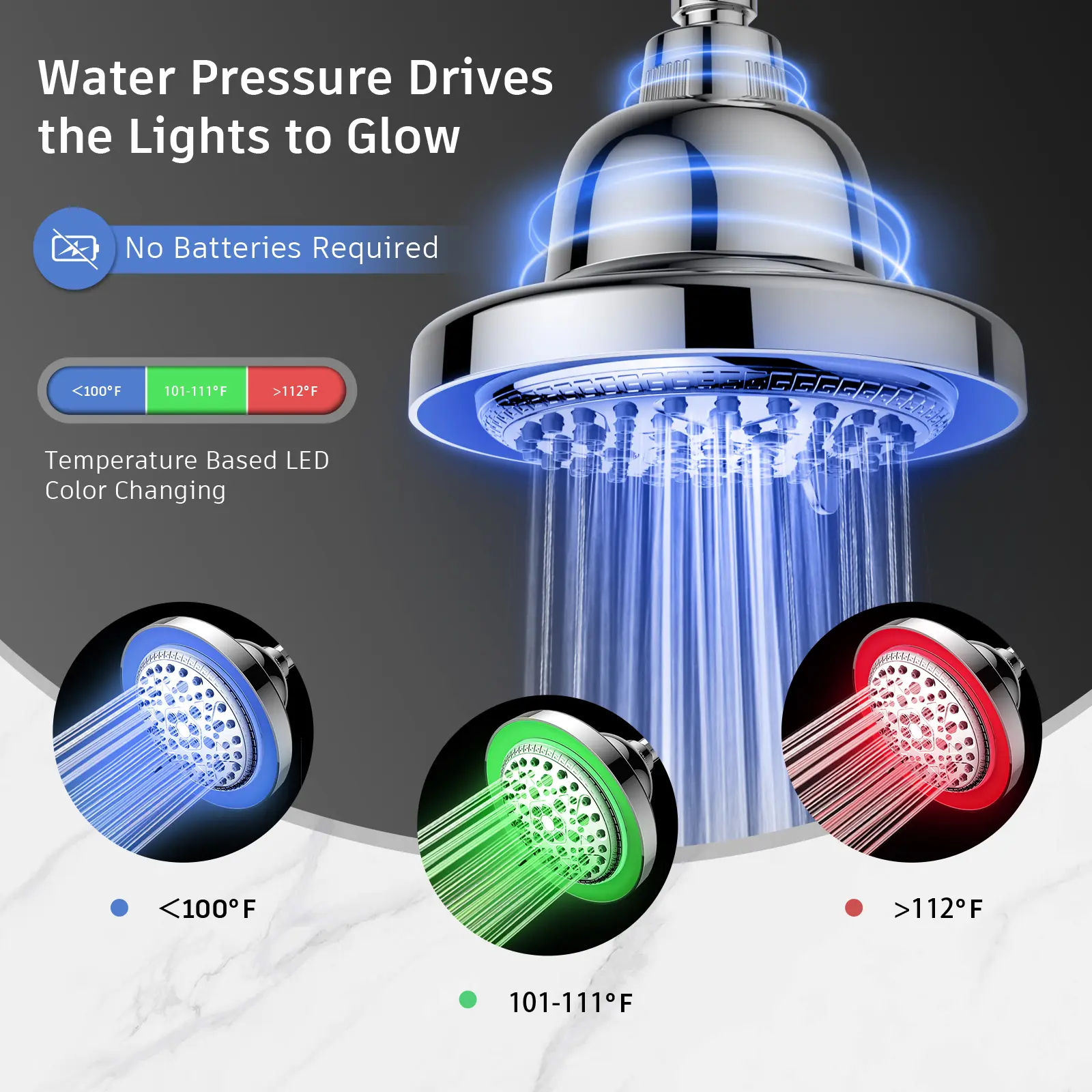 【Temperature sensing LED Lights】 LED light-emitting by water power, no batteries required, light color changes depend on water temperature (<100°F blue; 101-113°F green; 114-122°F red). Enjoy a amazing shower time. ATTENTION:When Red Light Flashing, Mean High Heat Over 122°F. The gorgeous LED light creating a vibrant atmosphere, add some fun to your shower routine, make you and the kids love bathing.