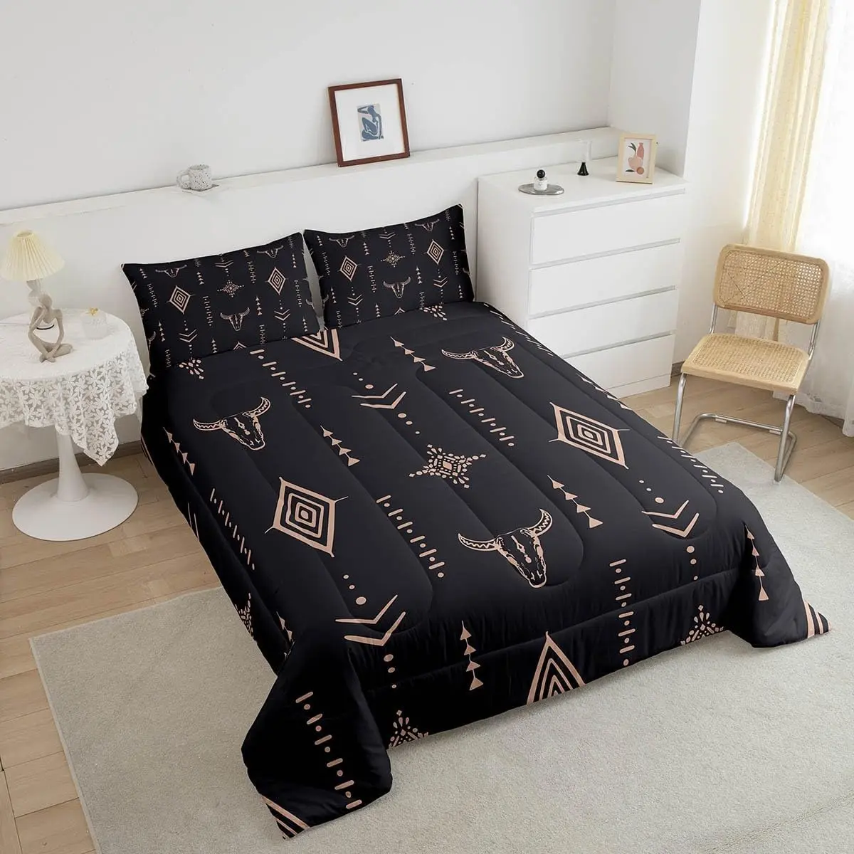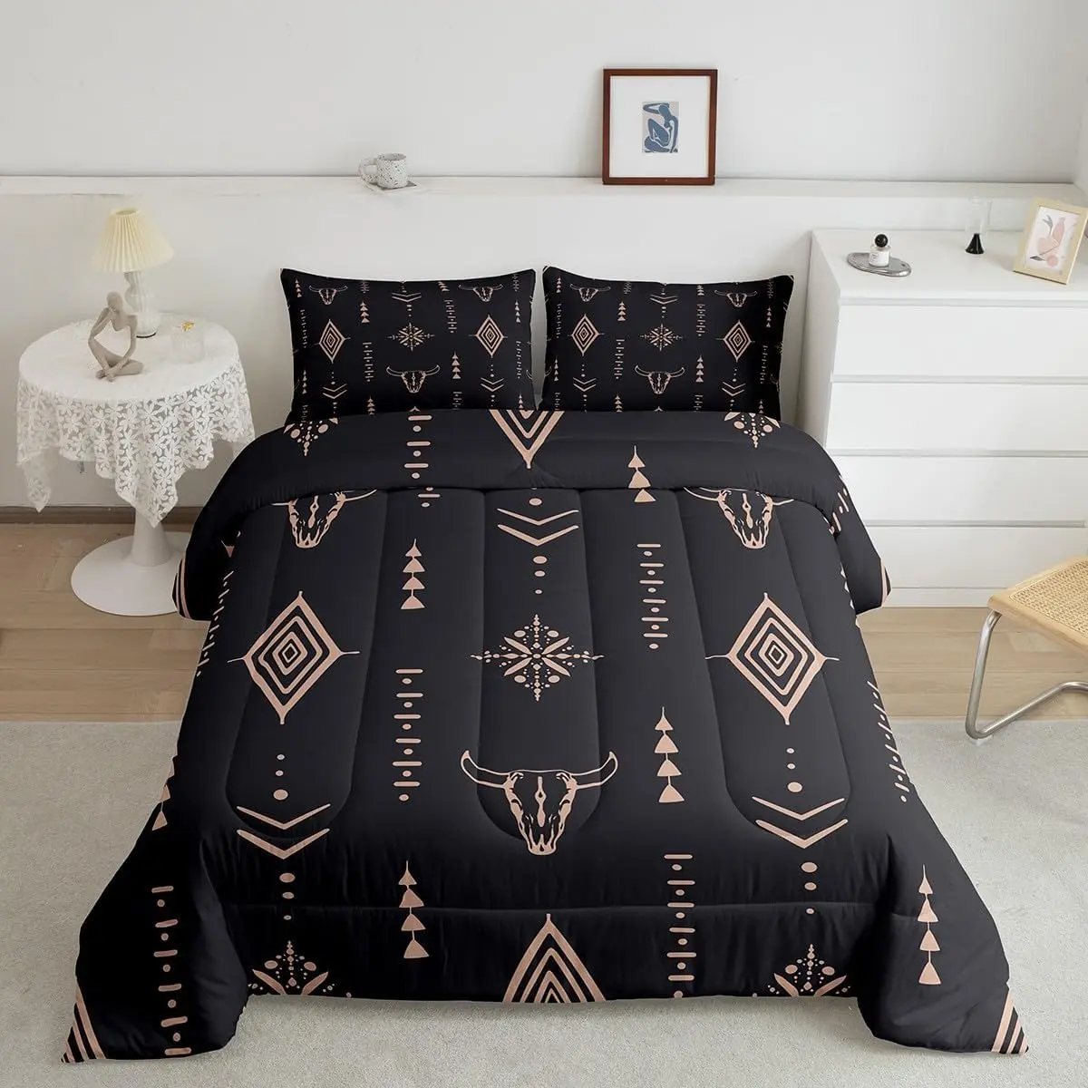 5. Bull Skull Comforter Set,Boho Ethnic Horns Bohemian Bedding Comforter Sets,Black Brown Tribal Symbol Mysterious Aztec Abstract Geometric Duvet Insert