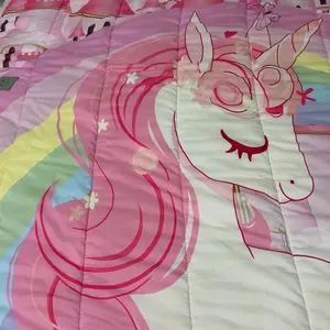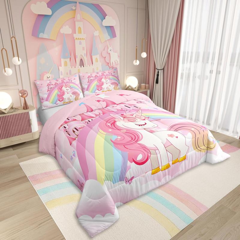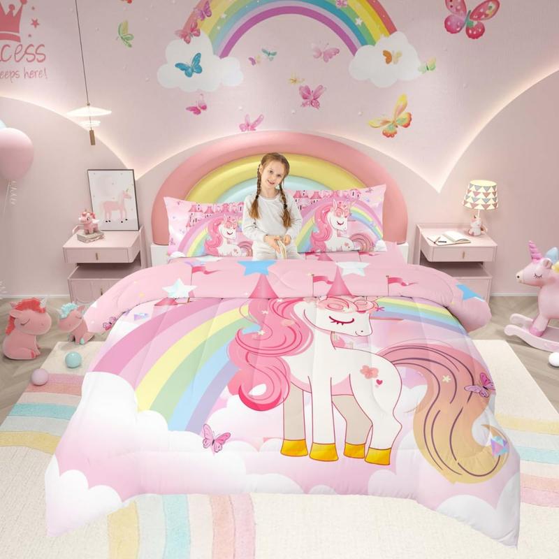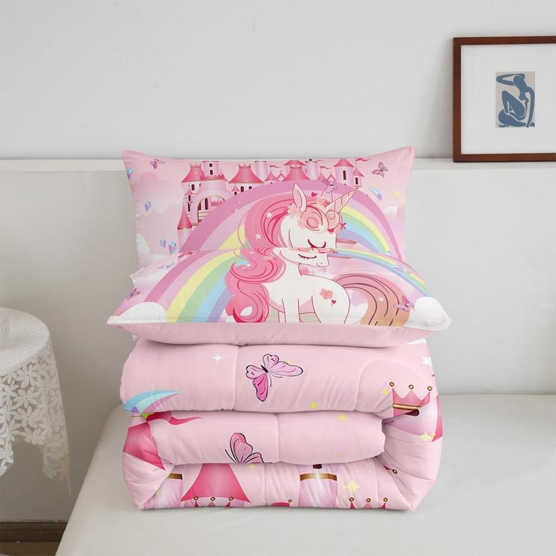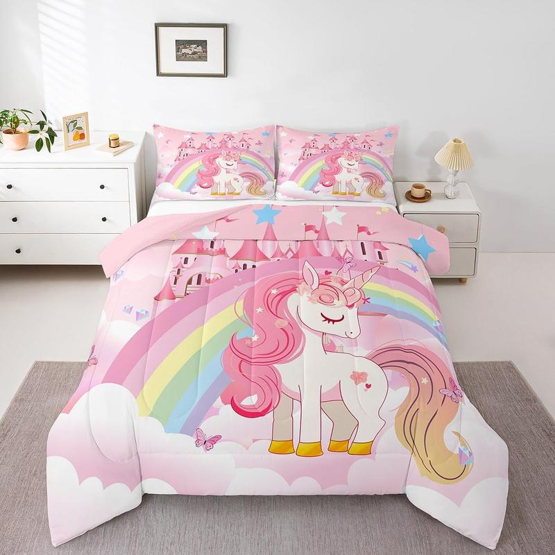 Girls Unicorn Bed Comforter Set,Rainbow Princess Pink Unicorn Bedding Set,Cute Castle Stars Reversible Bed Sets,Cartoon Horse Quilt Comforter Soft Fluffy Blanket Beddingsets