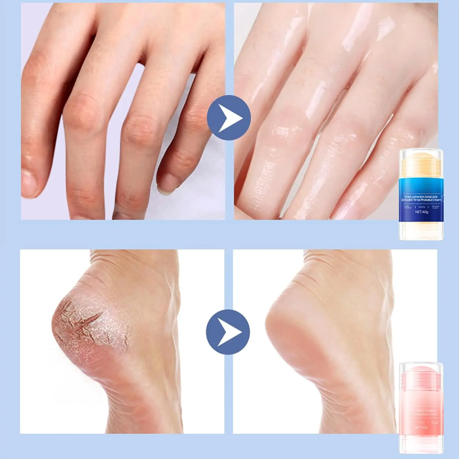 ·Cracked Heel Stick: This product includes a blue foot repair cream and a pink foot moisturizing stick. The blue stick focuses on repairing dry, cracked skin, dead skin, and rough areas. The pink stick provides long-lasting hydration, preventing dryness and softening the cuticle to keep skin soft and supple