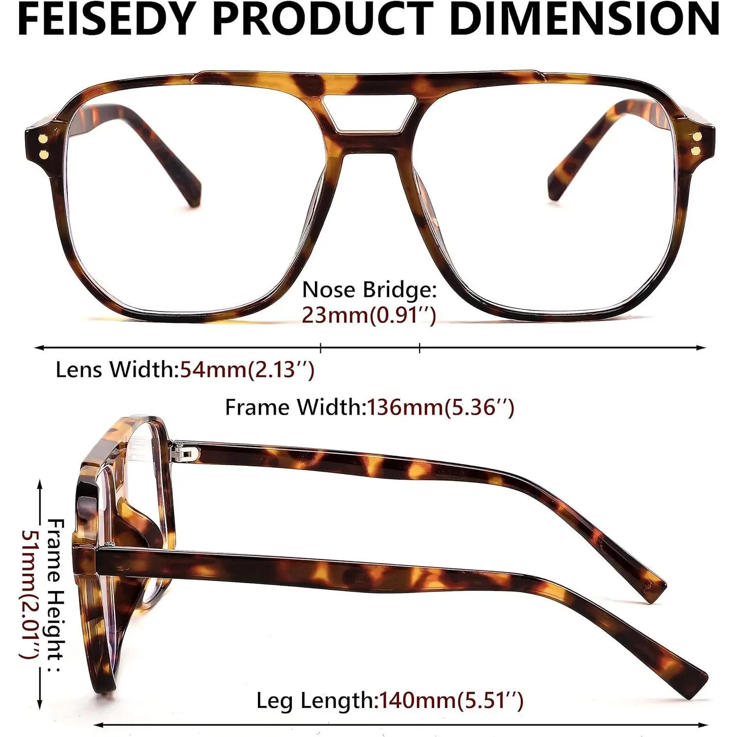 ·PRODUCT DIMENSION – Lens Width: 54mm(2.13'') | Frame Height: 51mm(2.01'') | Frame Width: 136mm(5.36'') | Nose Bridge: 23mm(0.91'')| Leg Length: 140mm(5.51'').