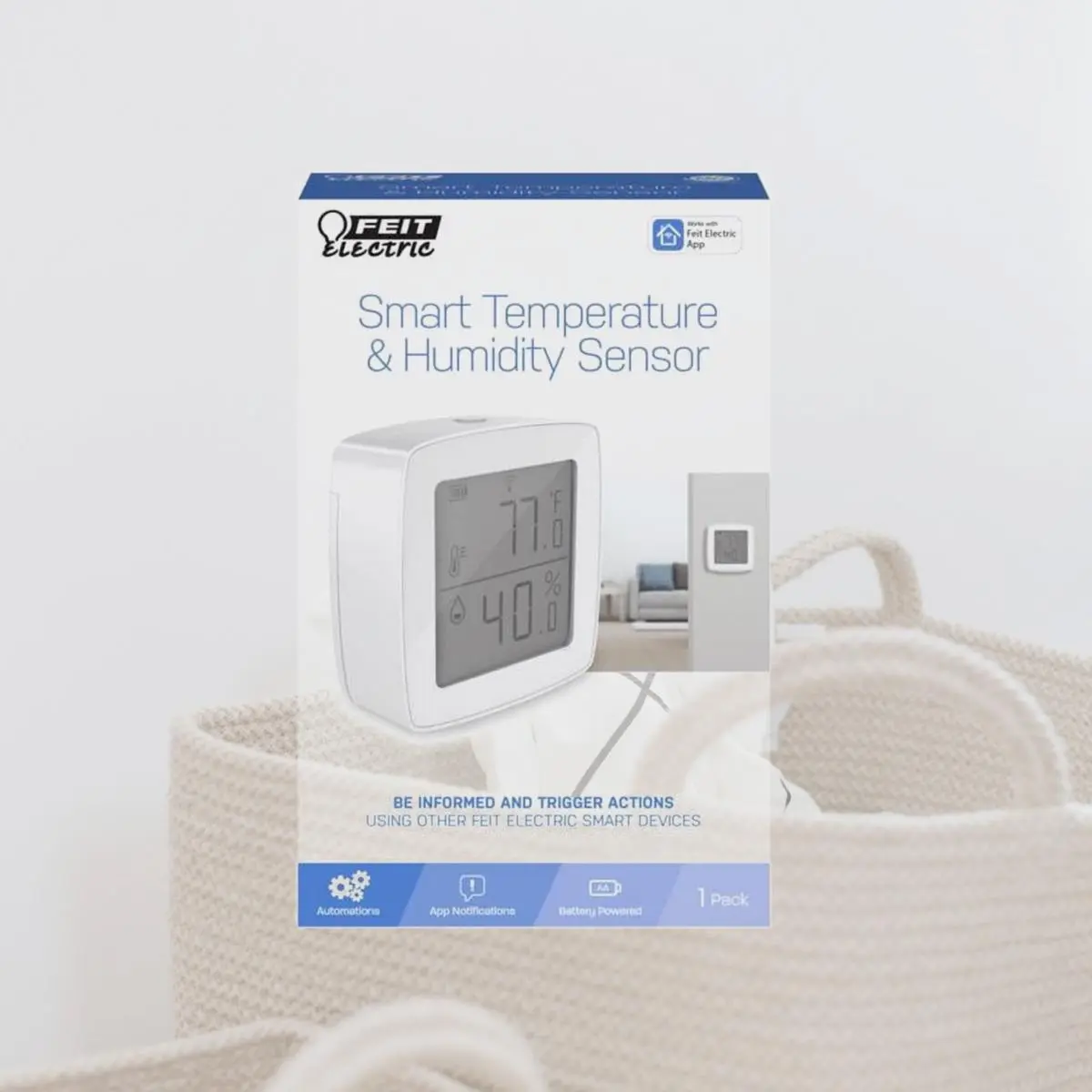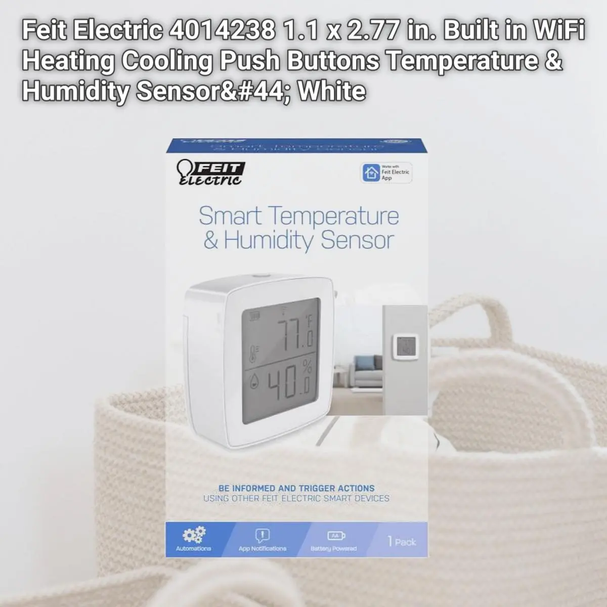 Keep an eye on the relative humidity and temperature of your home with the Feit Electric TEMP/WIFI Smart Temperature and Humidity Sensor, giving you peace of mind for your loved ones and furry friends whenever you are away from home. The sensor can easily be mounted in any space that you want to monitor and connect to the Feit Electric app. See the relative humidity & temperature in your room and utilize our Smart Scenes feature to connect to other appliances which can be turned on based on certain trigger thresholds. Have reptiles or tropical plants Set up a smart scene to turn on a smart plugged humidifier and a fan to increase the moisture level. Getting too cold but too comfy to get out of the covers to check the temperature Set a smart scene to automatically turn on your heat source without ever having to leave the bed or think about it. Specifications Color: White. Baseboard Heater Thermostat: No. Batteries Included: Yes. Built In WiFi: Yes. Shape: Square. Control Type: Push Buttons. Thermostat Type: Heating and Cooling. Voltage Rating: 120V. Warranty: 1 Year. Display Size: 1.1 x 2.77 in.. Weight: 0.44 lbs.
