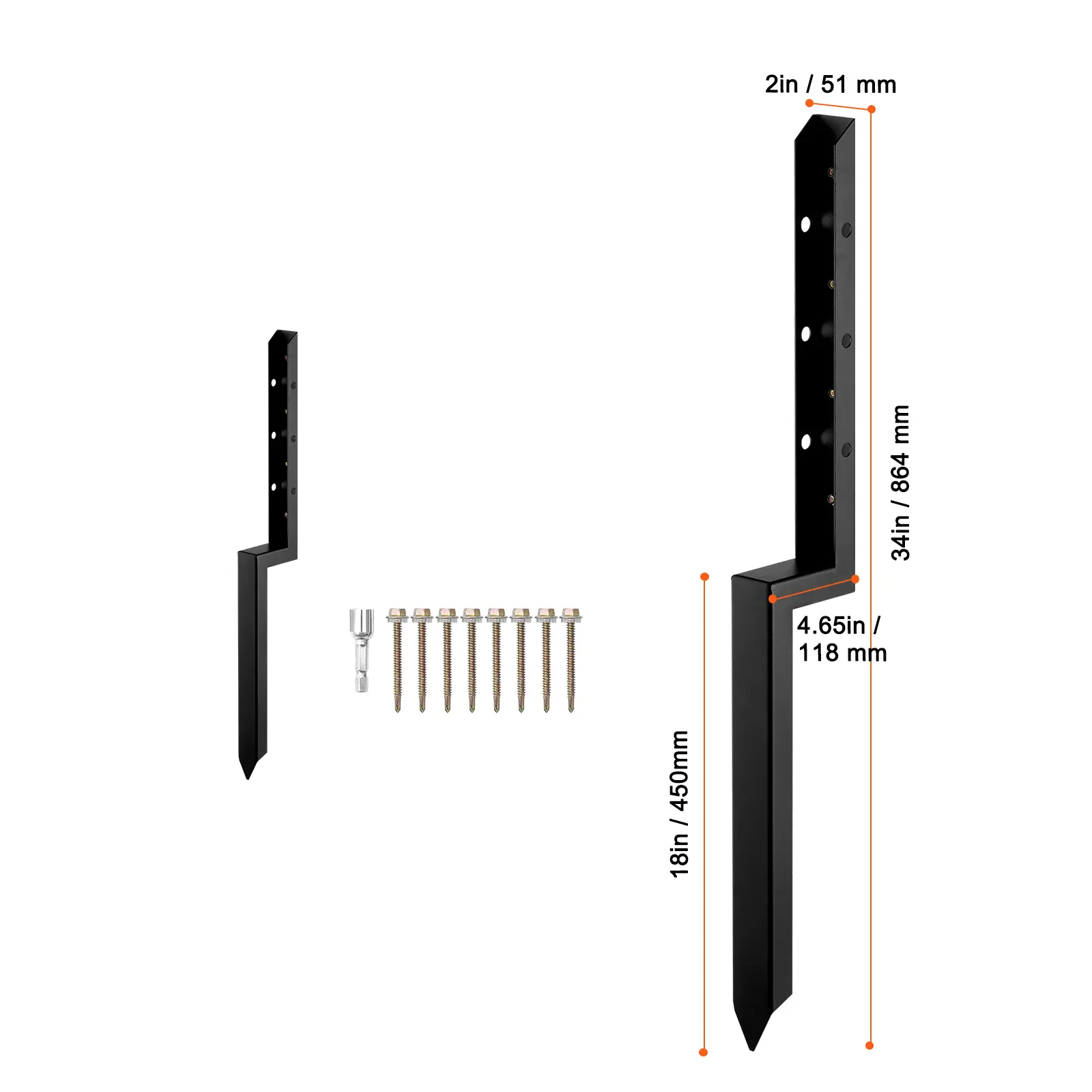 • Fits 2” Wood: External solid spike with a total height of 34 inches, a nail length of 12 inches, and a side width of 2 inches, suitable for 2-inch timber, providing excellent support.