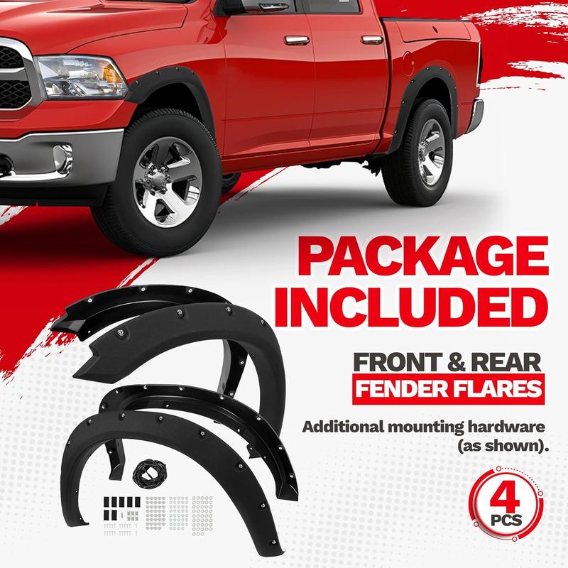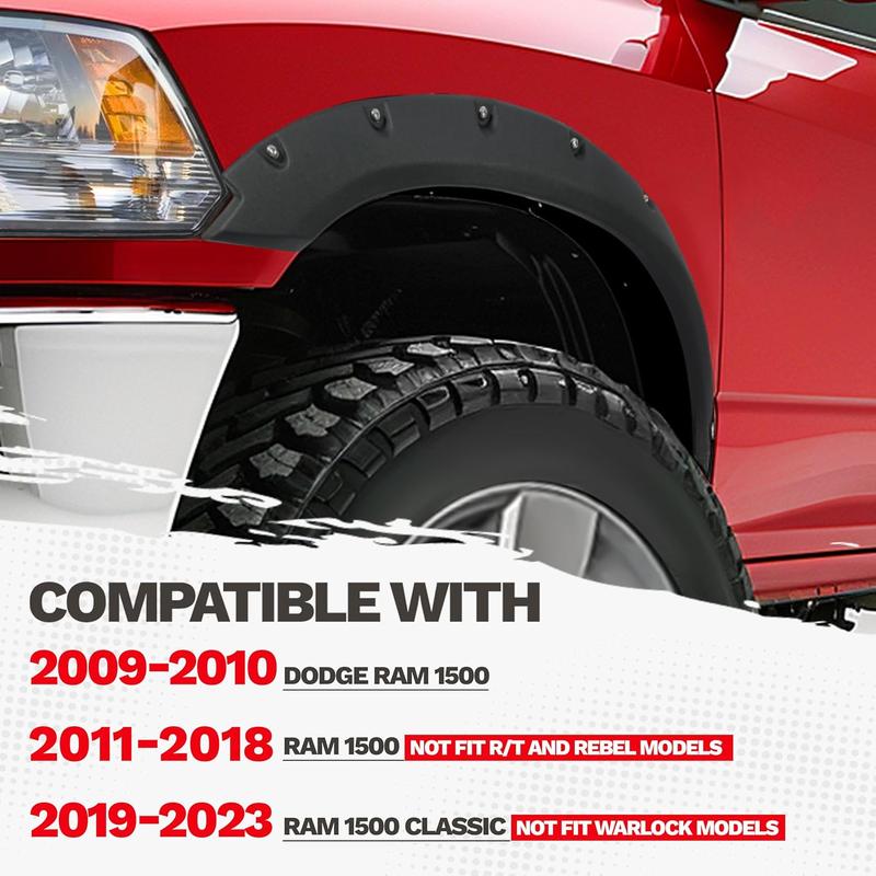 ·FITMENT- Fender Flares compatible with 2009-2010 Dodge RAM 1500 models only, 2011-2018 RAM 1500 models only(Does not fit R/T and Rebel models), 2019-2023 RAM 1500 Classic models only(Does not fit Warlock models). Packing list: 1 set of 4 pieces fender flares (2 for front and 2 for rear). Hardware for installation are included.