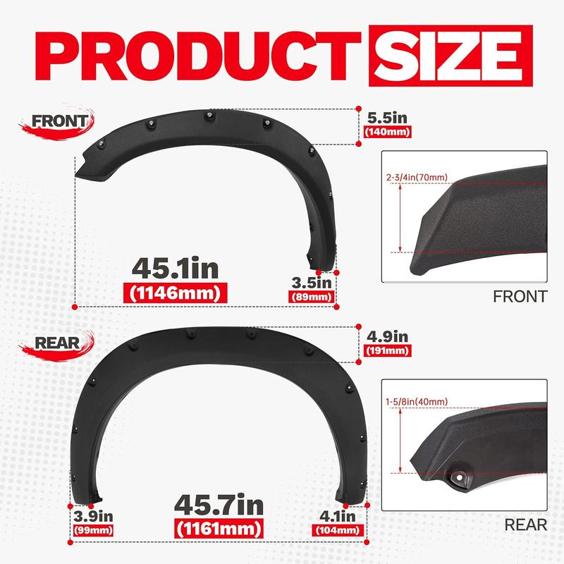 ·HEAVY DUTY- High quality injection moulding fender flares with precise edge cutting finish. Made of high quality polypropylene with paintable textured finish. Ensures enhanced durability, flexibility and strength for these flares to effectively withstand against cracking, warping and chalking offering a superior off-road driving experience. Durable matte black finish looks great or can be easily personalized.