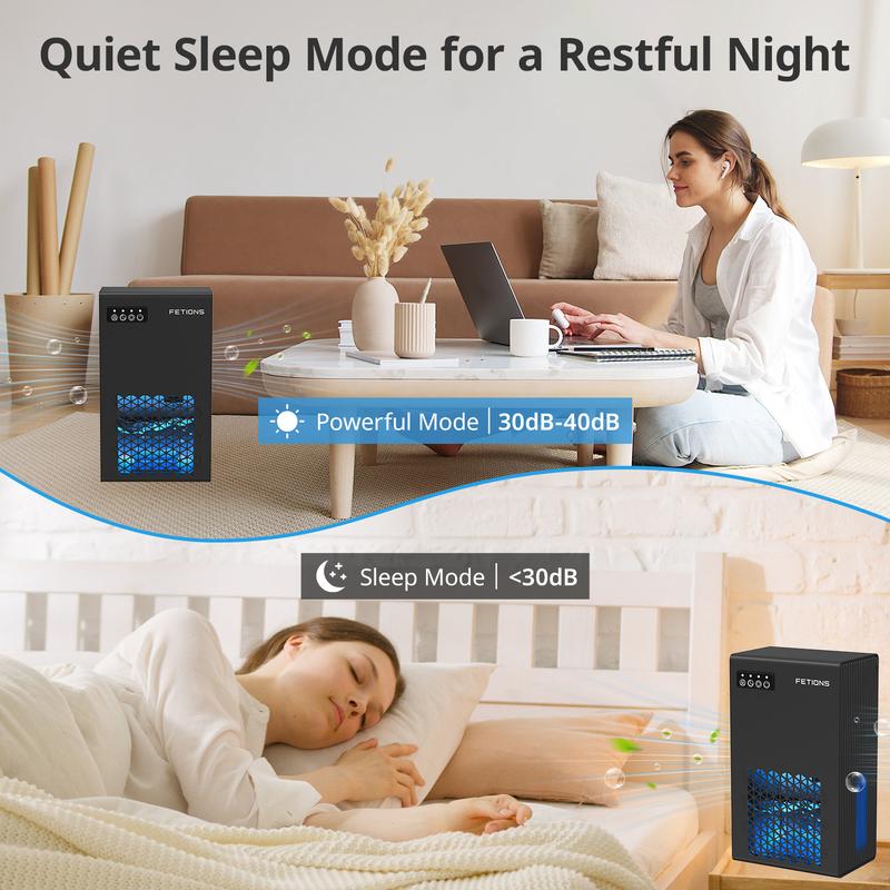 ·Two Working Modes:The Fetions Dehumidifier offers two operating modes: the High-Efficiency Mode, designed to rapidly reduce humidity in large spaces, and the Sleep Mode, which operates at a lower speed (