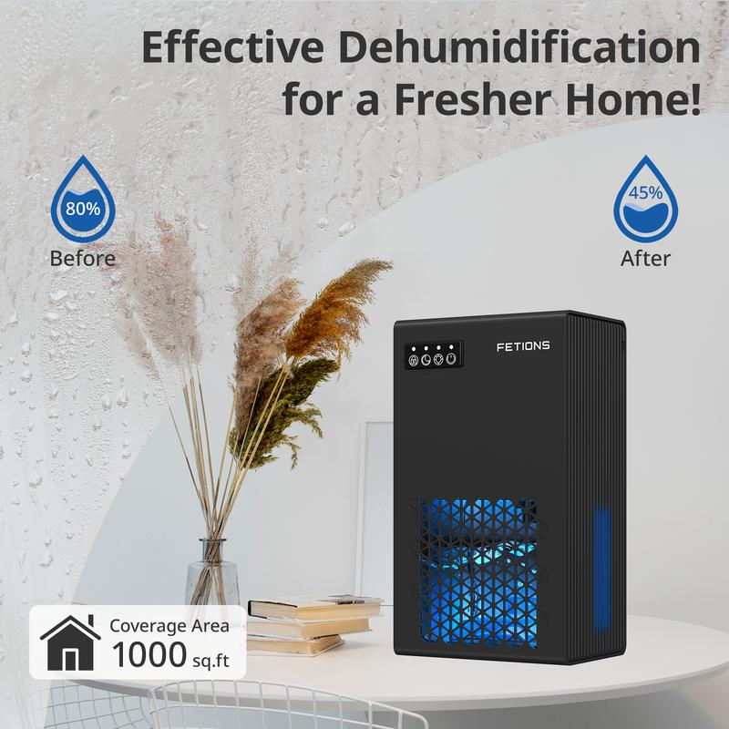 ·Compact and Portable:With compact dimensions of 6.69 (L) x 5.51 (W) x 15.75 (H) inches, the Fetions Dehumidifier is designed for easy portability. Despite its small size, it can effectively cover up to 1000 square feet, making it ideal for use in homes, offices, basements, or any space in need of moisture control.