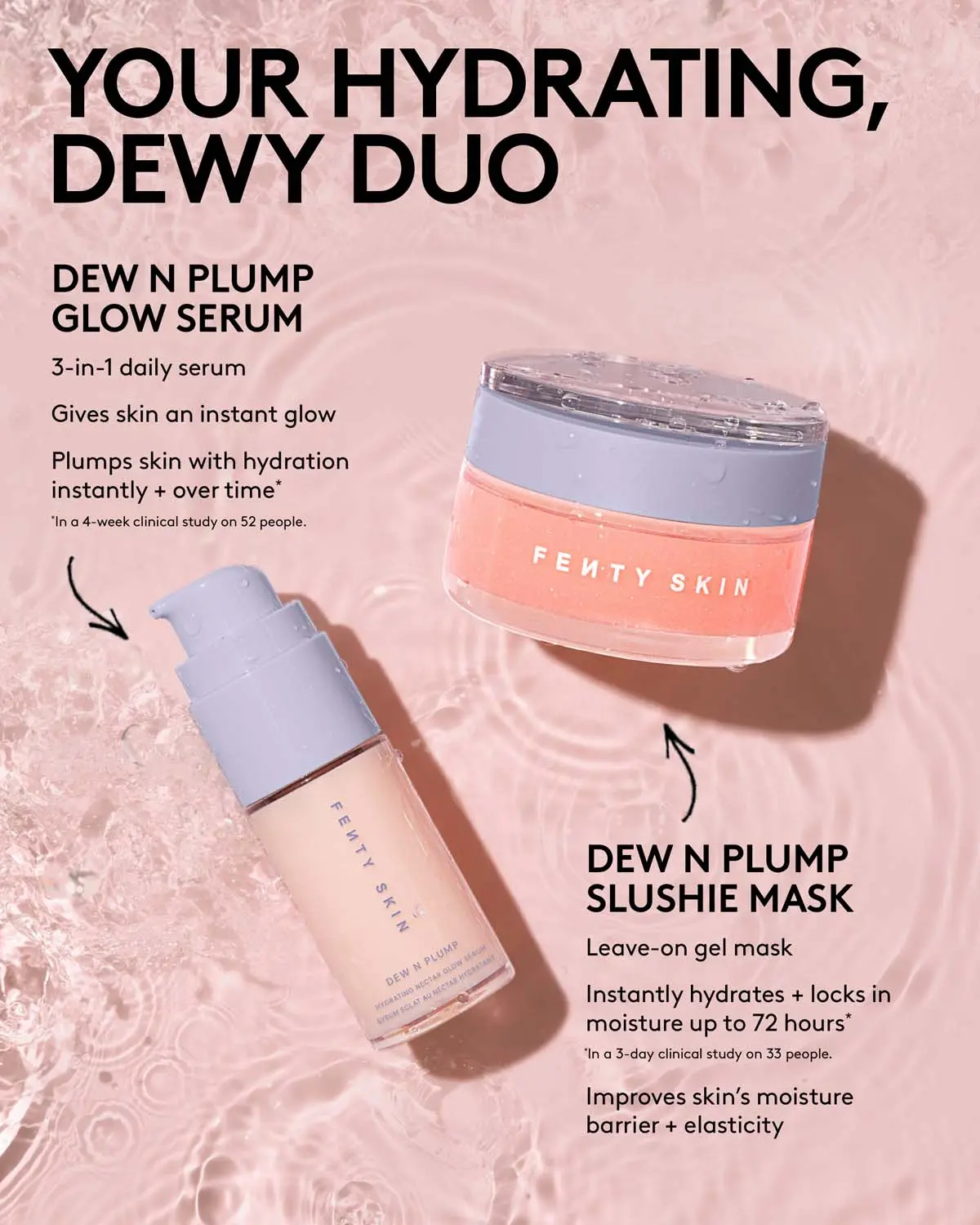 When skin’s feeling extra thirsty, give your moisture barrier a boost with skincare that hydrates, plumps + strengthens. During the day, drench your skin in hydration instantly + over time with a 3-in-1 glow serum. At night, apply skin’s super slushie: a leave-on mask that instantly hydrates + locks in moisture for up to 72 hours*. Together, they take your skin from dry—to juicy and revived.