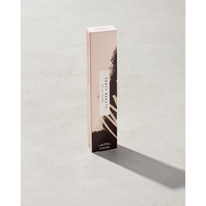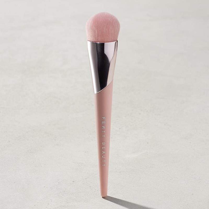 Meet the Fenty foundation brush designed to make skin look like skin. The Full-Bodied Foundation Brush 110 is the ultimate tool for applying any Fenty Beauty liquid foundation. This full-coverage foundation brush was made to give you the quick coverage of a flat paddle brush plus the seamless blending of an airbrush. In other words: Fast coverage with an air-touched finish.