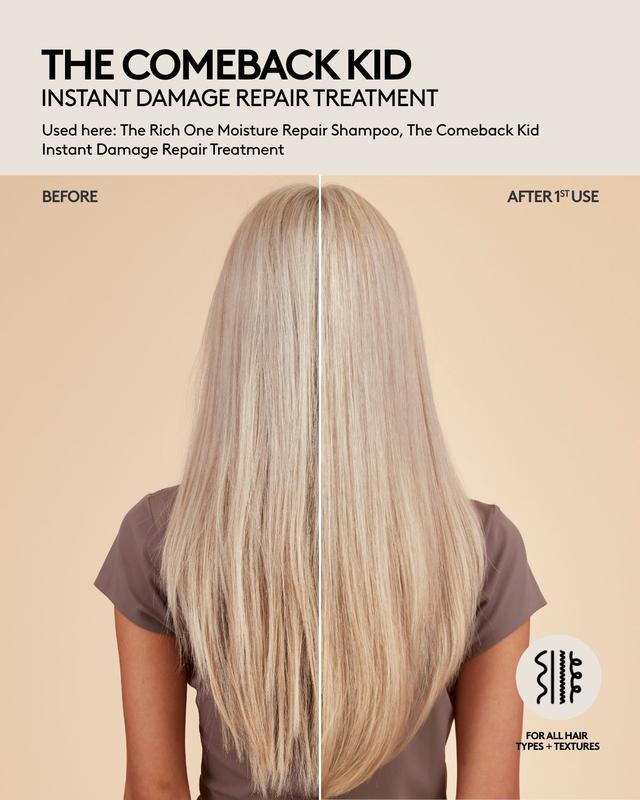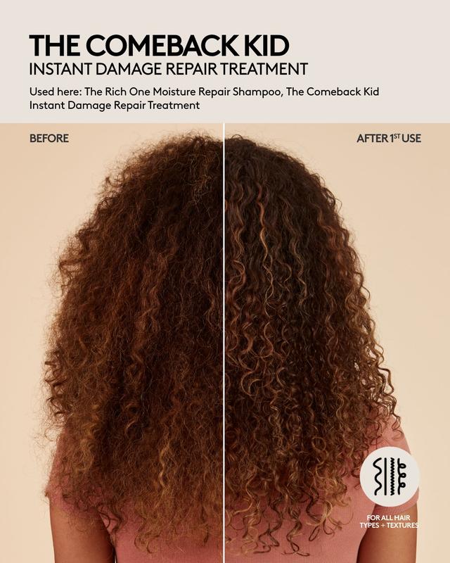 You’ve heard the bond-building hype, now get ready for professional-grade bond repair without the complicated steps—or breaking the bank. The Comeback Kid penetrates deep into the cortex to provide instant inside-out repair, support damaged keratin structures and strengthen strands. With the help of our proprietary bond-building formula, powered by amino acids—the building blocks of proteins—chia seed extract, and our unique complex, Replenicore-5, you’ll see up to 75% improvement in damage* and up to 72% stronger hair*. Hair instantly looks and feels healthier, moisturized, softer and smoother with just one use. It also can be used as a leave-in or rinsed out so adding it to your routine is too easy. Simply cleanse, use in place of your conditioner + style on 'em.