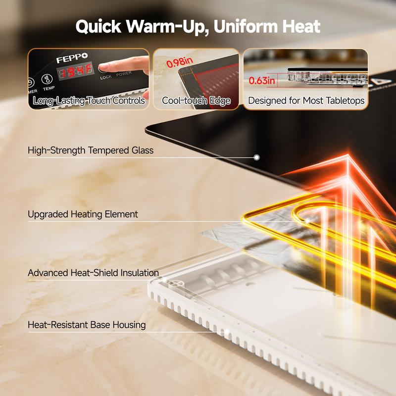 Tempered Glass Warming Mat for Food – Table-Ready Look, Fast Wipe-Clean: The sleek tempered-glass surface delivers an elevated, modern presentation while remaining easy to maintain—sauces, oil, and spills wipe away quickly after entertaining. The outer edge is designed to feel cooler to the touch to help reduce contact heat during serving. Designed for most tabletops to support confident everyday use.