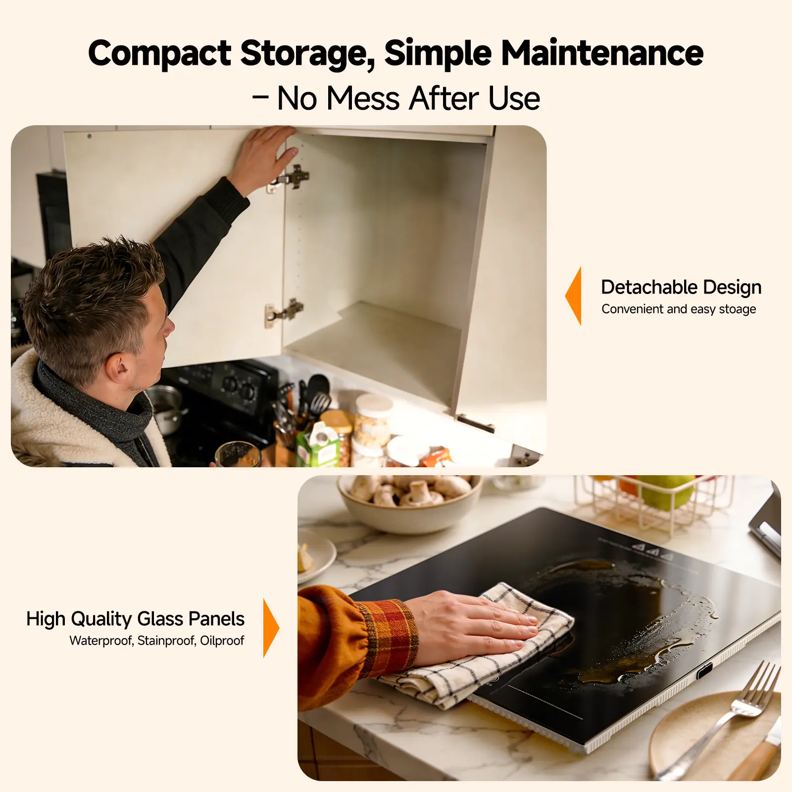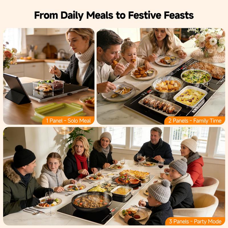 3-in-1 Modular & Expandable - Quick One-Step Connection: Use one panel for everyday meals, connect two for family dinners, or expand to three for buffet-style serving. Panels alignat the connector slots and slide into place in one simple step, so setup is fast with no tools. When the event is over, the panels stack into a compact footprint for storage in cabinets or pantry shelves. This modular design keeps your setup organized and makes it easy to bring out only what you need.